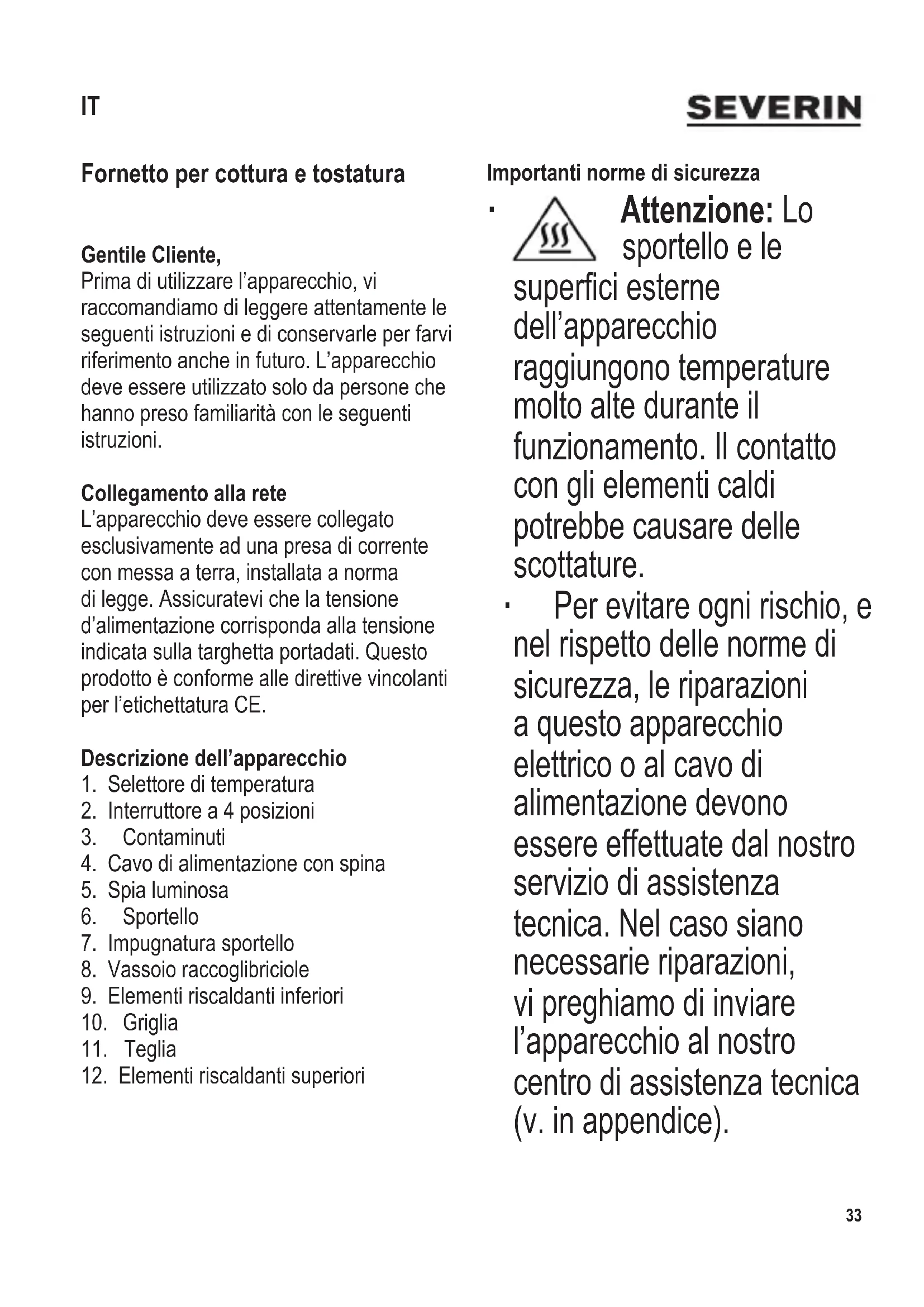 Fornetto per cottura e tostatura Gentile Cliente, Prima di utilizzare l’apparecchio, vi raccomandiamo di leggere attentamente le seguenti istruzioni e di conservarle per farvi riferimento anche in futuro. L’apparecchio deve essere utilizzato solo da persone che hanno preso familiarità con le seguenti istruzioni. Collegamento alla rete L’apparecchio deve essere collegato esclusivamente ad una presa di corrente con messa a terra, installata a norma di legge. Assicuratevi che la tensione d’alimentazione corrisponda alla tensione indicata sulla targhetta portadati. Questo prodotto è conforme alle direttive vincolanti per l’etichettatura CE. Descrizione dell’apparecchio