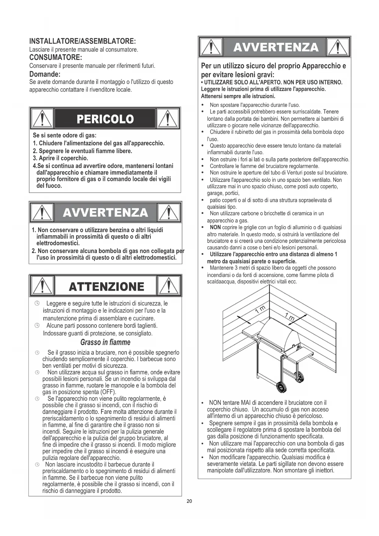 Gas-Art Butan Propan Butan, Propan oder deren Gemische Butan, Propan oder deren Gemische Gasdruck 28-30 mbar 37 mbar 30 mbar 50 mbar Injektorgröße (Durchm. mm) Grill: 0,86 x 2 Stk. Grill: 0,86 x 2 Stk. Grill: 0,68 x 2 Stk. Heizplatte: N/A Heizplatte: N/A Heizplatte: N/A Bestimmungsländer 6,15 kW (448 g/h) 5,28 kW (384,2 g/h) GB, FR, BE, ES, IT, PT, CZ, SK, CH, CY, GR, IE, LT, LU, LV, SI DK, NO, NL, SE, FI, IS, CZ, IT, SK, BG, CY, EE, HR, HU, LT, LU, LV, MT, RO, SI, TR AT, DE, CH, LU, SK 19INSTALLATORE/ASSEMBLATORE: Lasciare il presente manuale al consumatore. CONSUMATORE: Conservare il presente manuale per riferimenti futuri. Domande: Se avete domande durante il montaggio o l'utilizzo di questo apparecchio contattare il rivenditore locale. PERICOLO AVVERTENZA Se si sente odore di gas:1. Chiudere l'alimentazione del gas all'apparecchio.2. Spegnere le eventuali fiamme libere.3. Aprire il coperchio.4.Se si continua ad avvertire odore, mantenersi lontanidall'apparecchio e chiamare immediatamente ilproprio fornitore di gas o il comando locale dei vigilidel fuoco.1. Non conservare o utilizzare benzina o altri liquidiinfiammabili in prossimità di questo o di altrielettrodomestici.2. Non conservare alcuna bombola di gas non collegata perl'uso in prossimità di questo o di altri elettrodomestici. ATTENZIONE º Leggere e seguire tutte le istruzioni di sicurezza, leistruzioni di montaggio e le indicazioni per l'uso e lamanutenzione prima di assemblare e cucinare.º Alcune parti possono contenere bordi taglienti.Indossare guanti di protezione, se consigliato. Grasso in fiamme º Se il grasso inizia a bruciare, non è possibile spegnerlochiudendo semplicemente il coperchio. I barbecue sonoben ventilati per motivi di sicurezza.º Non utilizzare acqua sul grasso in fiamme, onde evitarepossibili lesioni personali. Se un incendio si sviluppa dalgrasso in fiamme, ruotare le manopole e la bombola delgas in posizione spenta (OFF).º Se l'apparecchio non viene pulito regolarmente, èpossibile che il grasso si incendi, con il rischio didanneggiare il prodotto. Fare molta attenzione durante ilpreriscaldamento o lo spegnimento di residui di alimentiin fiamme, al fine di garantire che il grasso non siincendi. Seguire le istruzioni per la pulizia generaledell'apparecchio e la pulizia del gruppo bruciatore, alfine di impedire che il grasso si incendi. Il modo miglioreper impedire che il grasso si incendi è eseguire unapulizia regolare dell'apparecchio.º Non lasciare incustodito il barbecue durante ilpreriscaldamento o lo spegnimento di residui di alimentiin fiamme. Se il barbecue non viene pulitoregolarmente, è possibile che il grasso si incendi, con ilrischio di danneggiare il prodotto. AVVERTENZA Per un utilizzo sicuro del proprio Apparecchio e per evitare lesioni gravi:
