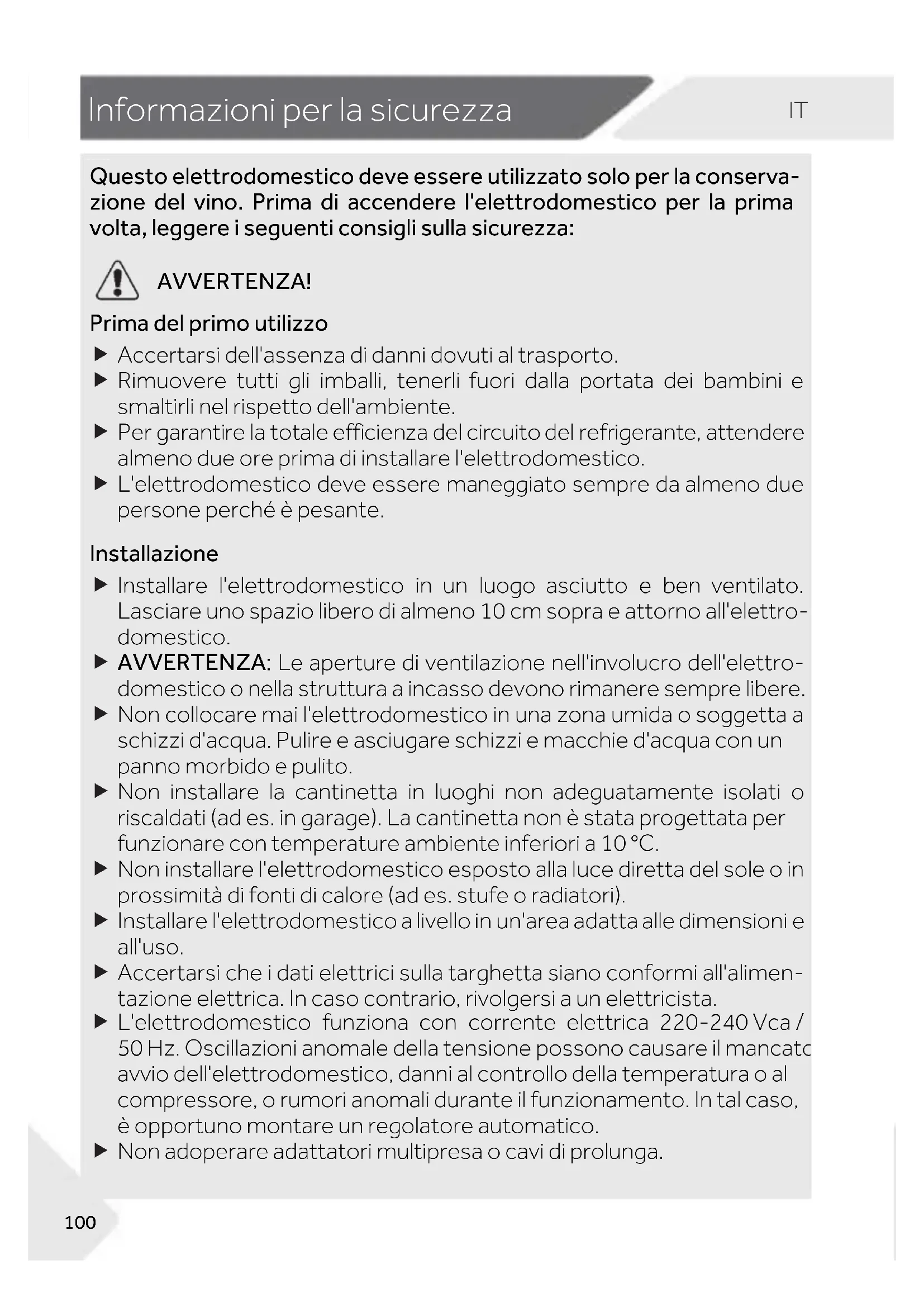 AVVERTENZA! Prima del primo utilizzo Accertarsi dell'assenza di danni dovuti al trasporto. Rimuovere tutti gli imballi, tenerli fuori dalla portata dei bambini e smaltirli nel rispetto dell'ambiente. Per garantire la totale efficienza del circuito del refrigerante, attendere almeno due ore prima di installare l'elettrodomestico. L'elettrodomestico deve essere maneggiato sempre da almeno due persone perché è pesante. Installazione Installare l'elettrodomestico in un luogo asciutto e ben ventilato. Lasciare uno spazio libero di almeno 10 cm sopra e attorno all'elettro- domestico. AVVERTENZA: Le aperture di ventilazione nell'involucro dell'elettro- domestico o nella struttura a incasso devono rimanere sempre libere. Non collocare mai l'elettrodomestico in una zona umida o soggetta a schizzi d'acqua. Pulire e asciugare schizzi e macchie d'acqua con un panno morbido e pulito. Non installare la cantinetta in luoghi non adeguatamente isolati o riscaldati (ad es. in garage). La cantinetta non è stata progettata per funzionare con temperature ambiente inferiori a 10 °C. Non installare l'elettrodomestico esposto alla luce diretta del sole o in prossimità di fonti di calore (ad es. stufe o radiatori). Installare l'elettrodomestico a livello in un'area adatta alle dimensioni e all'uso. Accertarsi che i dati elettrici sulla targhetta siano conformi all'alimen- tazione elettrica. In caso contrario, rivolgersi a un elettricista. L'elettrodomestico funziona con corrente elettrica 220-240 Vca / 50 Hz. Oscillazioni anomale della tensione possono causare il mancato avvio dell'elettrodomestico, danni al controllo della temperatura o al compressore, o rumori anomali durante il funzionamento. In tal caso, è opportuno montare un regolatore automatico. Non adoperare adattatori multipresa o cavi di prolunga.IT Informazioni per la sicurezza