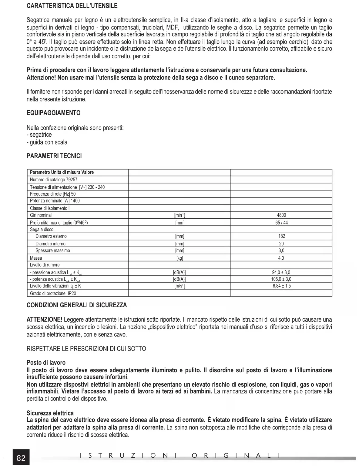 . Il taglio può essere eff ettuato solo in linea retta. Non eff ettuare il taglio lungo la curva (ad esempio cerchio), dato che questo può provocare un incidente o la distruzione della sega e dell’utensile elettrico. Il funzionamento corretto, affi dabile e sicuro dell’elettroutensile dipende dall’uso corretto, per cui: Prima di procedere con il lavoro leggere attentamente l’istruzione e conservarla per una futura consultazione. Attenzione! Non usare mai l’utensile senza la protezione della sega a disco e il cuneo separatore. Il fornitore non risponde per i danni arrecati in seguito dell’inosservanza delle norme di sicurezza e delle raccomandazioni riportate nella presente istruzione. EQUIPAGGIAMENTO Nella confezione originale sono presenti: - segatrice - guida con scala PARAMETRI TECNICI Parametro Unità di misura Valore Numero di catalogo 79257 Tensione di alimentazione [V~] 230 - 240 Frequenza di rete [Hz] 50 Potenza nominale [W] 1400 Classe di isolamento II Giri nominali [min