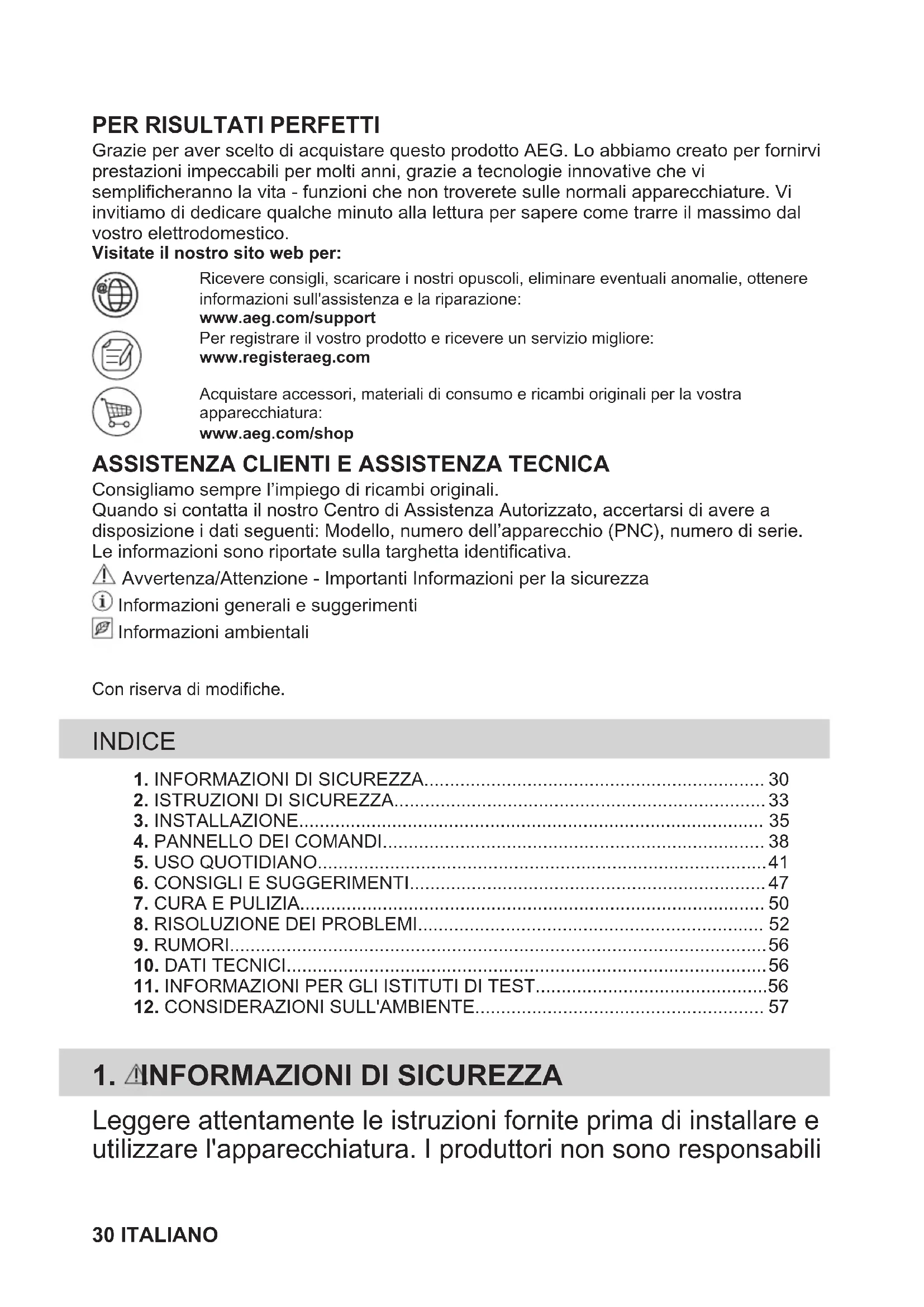 Grazie per aver scelto di acquistare questo prodotto AEG. Lo abbiamo creato per fornirviprestazioni impeccabili per molti anni, grazie a tecnologie innovative che visemplificheranno la vita - funzioni che non troverete sulle normali apparecchiature. Viinvitiamo di dedicare qualche minuto alla lettura per sapere come trarre il massimo dalvostro elettrodomestico.Visitate il nostro sito web per:Ricevere consigli, scaricare i nostri opuscoli, eliminare eventuali anomalie, ottenereinformazioni sull'assistenza e la riparazione:www.aeg.com/supportPer registrare il vostro prodotto e ricevere un servizio migliore:www.registeraeg.comAcquistare accessori, materiali di consumo e ricambi originali per la vostraapparecchiatura:www.aeg.com/shop
