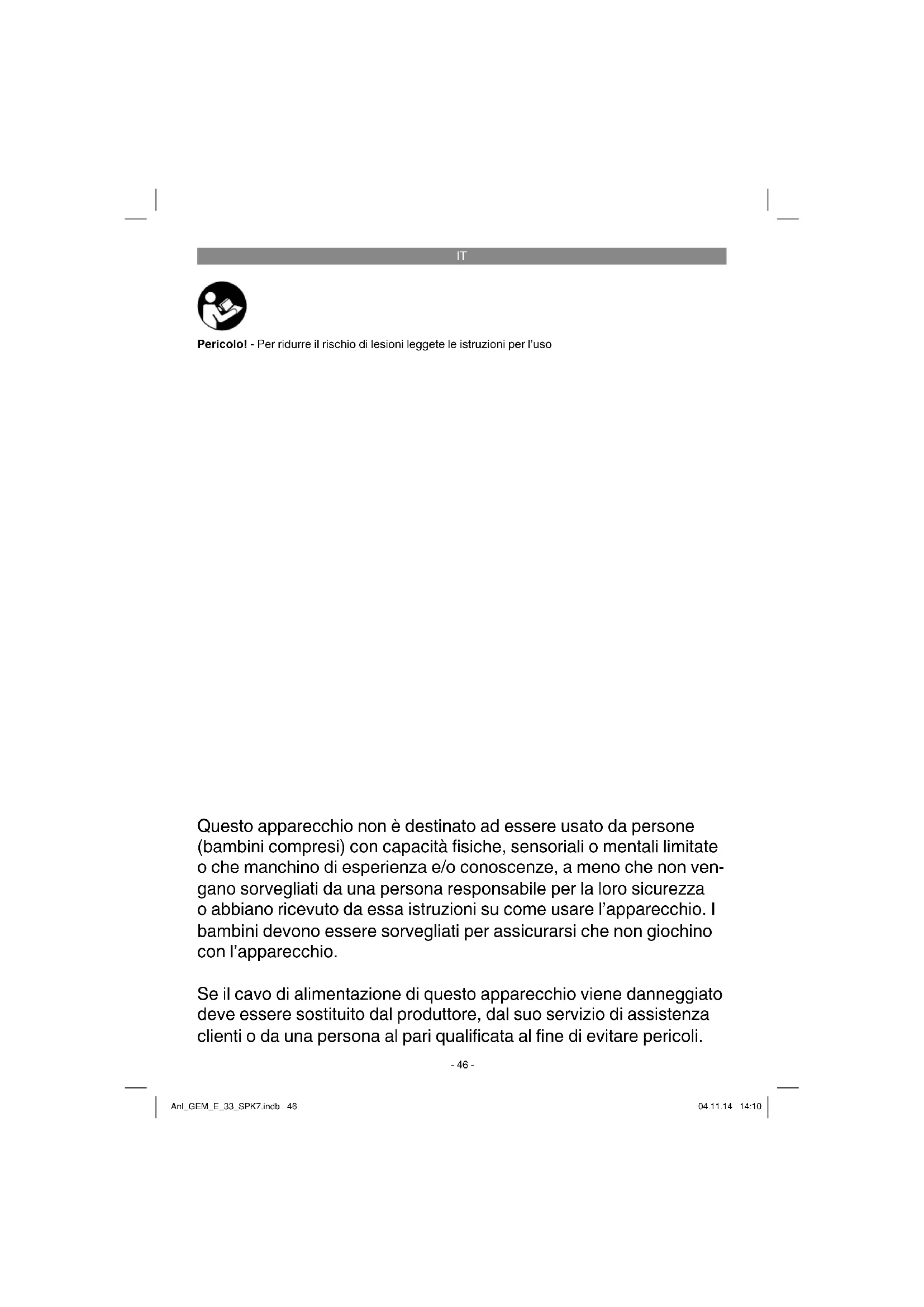 Pericolo! - Per ridurre il rischio di lesioni leggete le istruzioni per l’uso Questo apparecchio non è destinato ad essere usato da persone (bambini compresi) con capacità fi siche, sensoriali o mentali limitate o che manchino di esperienza e/o conoscenze, a meno che non ven- gano sorvegliati da una persona responsabile per la loro sicurezza o abbiano ricevuto da essa istruzioni su come usare l’apparecchio. I bambini devono essere sorvegliati per assicurarsi che non giochino con l’apparecchio. Se il cavo di alimentazione di questo apparecchio viene danneggiato deve essere sostituito dal produttore, dal suo servizio di assistenza clienti o da una persona al pari qualifi cata al fi ne di evitare pericoli. Anl_GEM_E_33_SPK7.indb 46Anl_GEM_E_33_SPK7.indb 46 04.11.14 14:1004.11.14 14:10IT