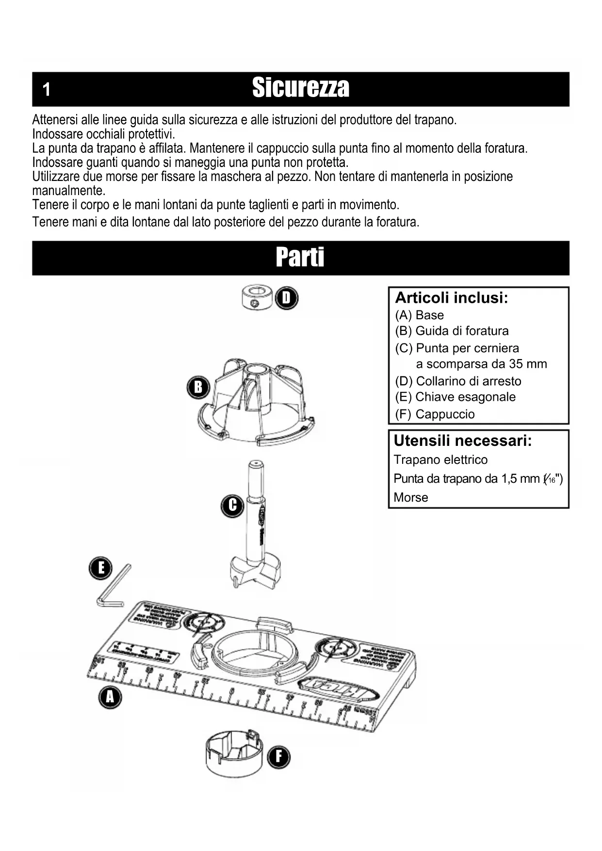 Articoli inclusi: (A) Base(B) Guida di foratura(C) Punta per cerniera a scomparsa da 35 mm(D) Collarino di arresto(E) Chiave esagonale(F) Cappuccio Utensili necessari: Trapano elettricoPunta da trapano da 1,5 mm ( ⁄16")Morse FAssemblaggio