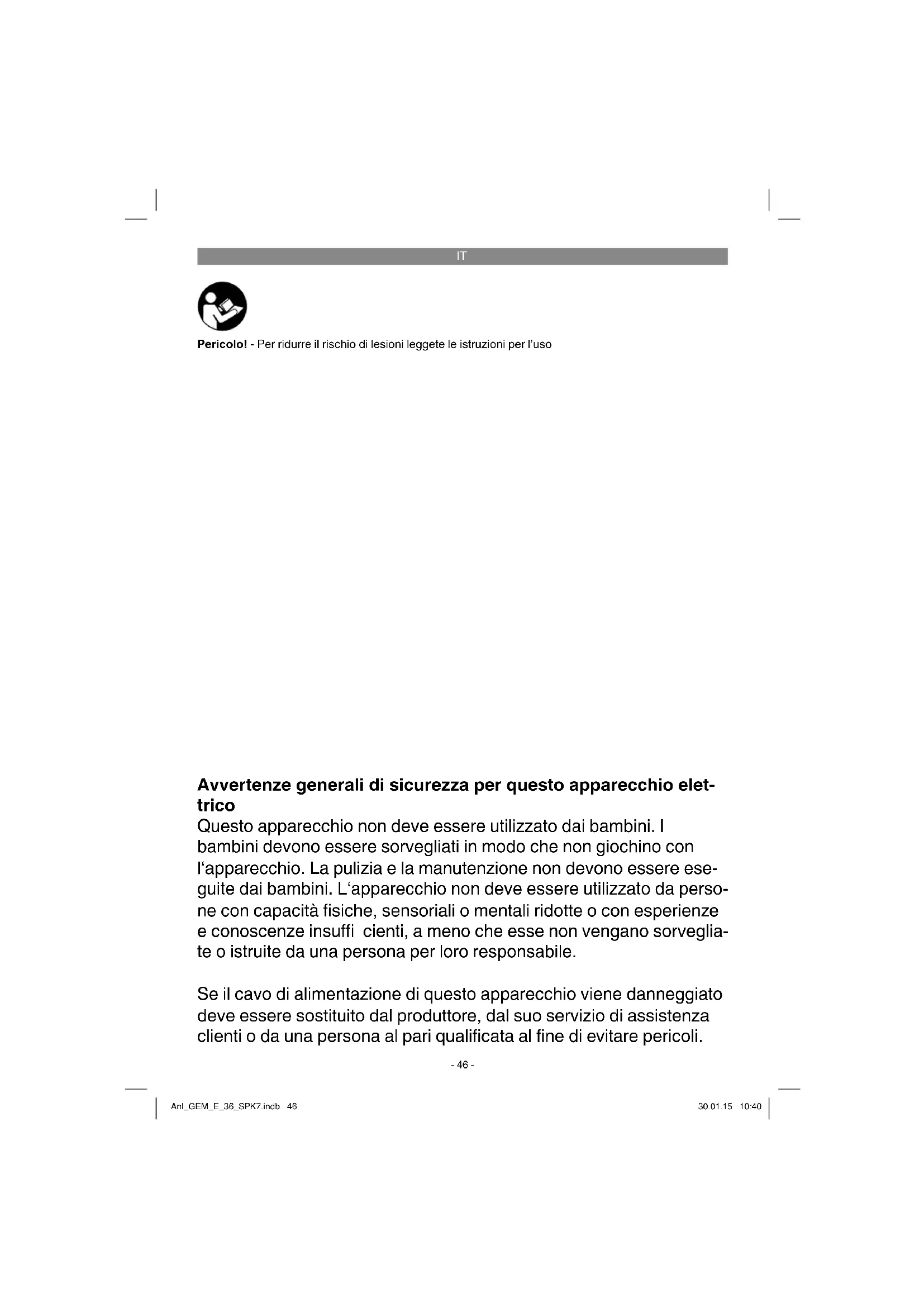 Pericolo! - Per ridurre il rischio di lesioni leggete le istruzioni per l’uso Avvertenze generali di sicurezza per questo apparecchio elet- trico Questo apparecchio non deve essere utilizzato dai bambini. I bambini devono essere sorvegliati in modo che non giochino con l‘apparecchio. La pulizia e la manutenzione non devono essere ese- guite dai bambini. L‘apparecchio non deve essere utilizzato da perso- ne con capacità fi siche, sensoriali o mentali ridotte o con esperienze e conoscenze insuffi cienti, a meno che esse non vengano sorveglia- te o istruite da una persona per loro responsabile. Se il cavo di alimentazione di questo apparecchio viene danneggiato deve essere sostituito dal produttore, dal suo servizio di assistenza clienti o da una persona al pari qualifi cata al fi ne di evitare pericoli. Anl_GEM_E_36_SPK7.indb 46Anl_GEM_E_36_SPK7.indb 46 30.01.15 10:4030.01.15 10:40IT