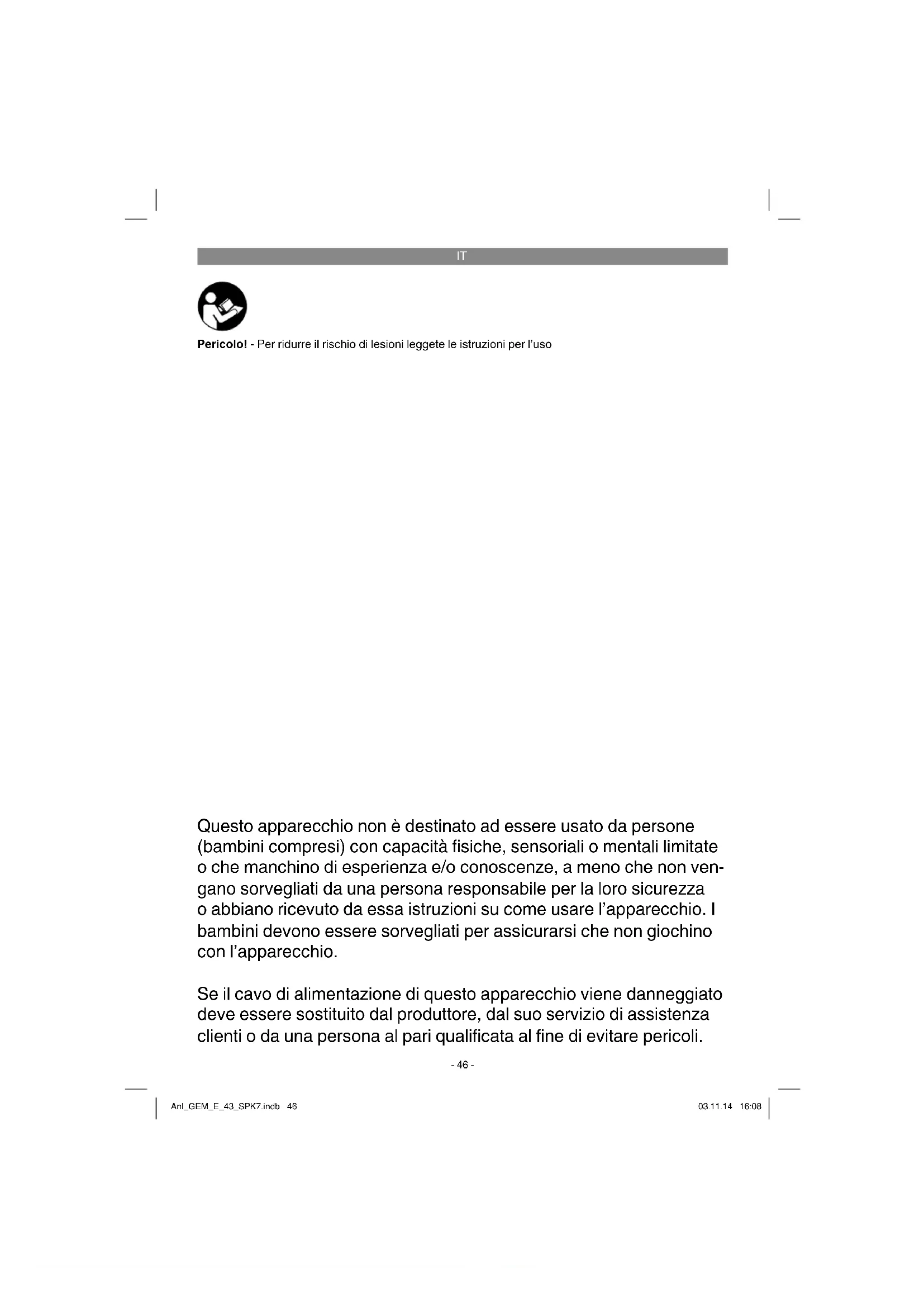 Pericolo! - Per ridurre il rischio di lesioni leggete le istruzioni per l’uso Questo apparecchio non è destinato ad essere usato da persone (bambini compresi) con capacità fi siche, sensoriali o mentali limitate o che manchino di esperienza e/o conoscenze, a meno che non ven- gano sorvegliati da una persona responsabile per la loro sicurezza o abbiano ricevuto da essa istruzioni su come usare l’apparecchio. I bambini devono essere sorvegliati per assicurarsi che non giochino con l’apparecchio. Se il cavo di alimentazione di questo apparecchio viene danneggiato deve essere sostituito dal produttore, dal suo servizio di assistenza clienti o da una persona al pari qualifi cata al fi ne di evitare pericoli. Anl_GEM_E_43_SPK7.indb 46Anl_GEM_E_43_SPK7.indb 46 03.11.14 16:0803.11.14 16:08IT