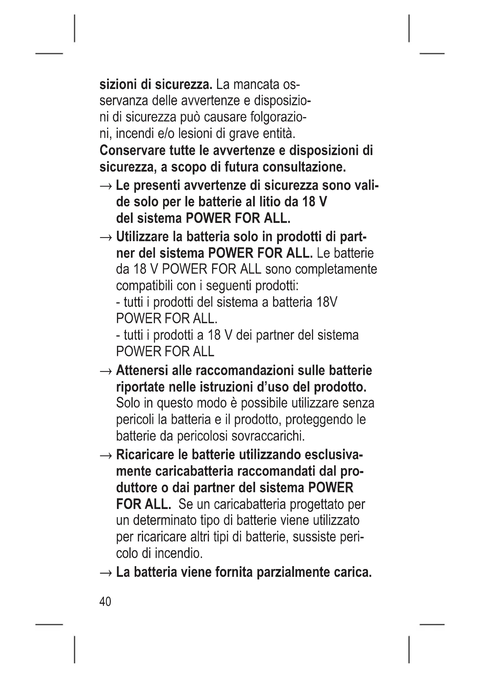 Le presenti avvertenze di sicurezza sono vali- de solo per le batterie al litio da 18 V del sistema POWER FOR ALL.