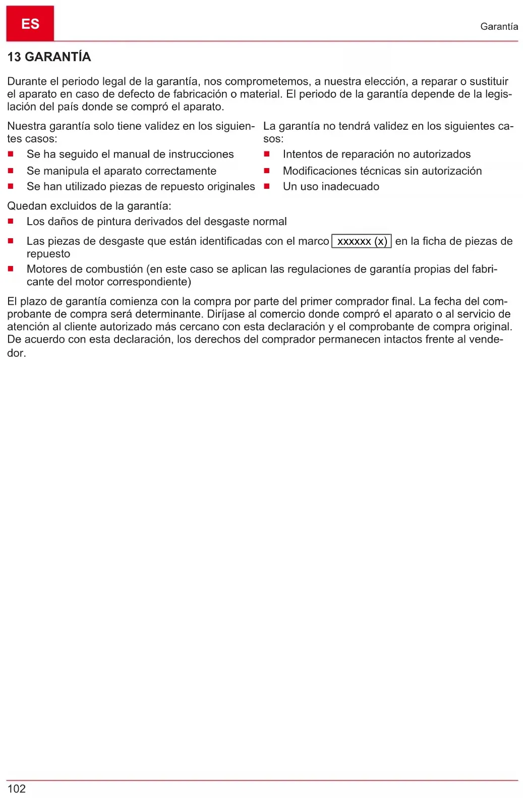 Motori a scoppio (per questi valgono le disposizioni di garanzia separate dei rispettivi costruttori del motore) Il periodo di garanzia inizia con l'acquisto da parte del primo consumatore finale. Fondamentali sono la data e la ricevuta di acquisto. Rivolgersi al proprio rivenditore o al centro di assistenza autorizzato più vicino presentando la presente garanzia e la ricevuta di acquisto originale. La presente dichiarazione di garanzia non altera i diritti derivanti da vizi del prodotto spettanti per legge all'acquirente nei con- fronti del venditore.SI