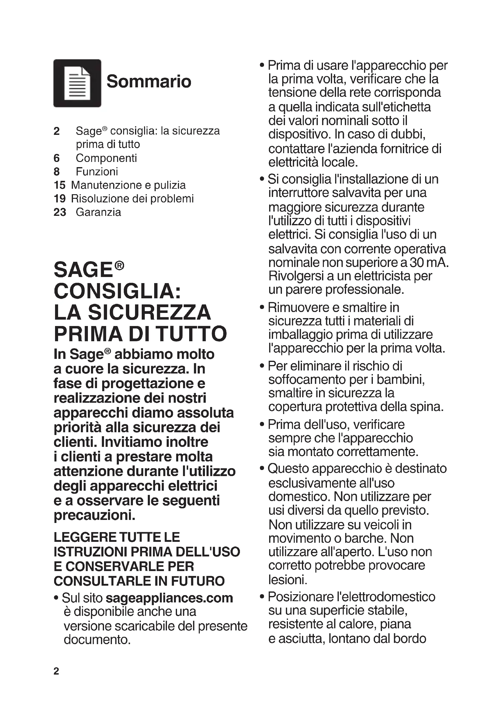 BES880 / SES8802 2 Sage consiglia: la sicurezza prima di tutto6 Componenti8 Funzioni15 Manutenzione e pulizia19 Risoluzione dei problemi23 Garanzia Sommario SAGE