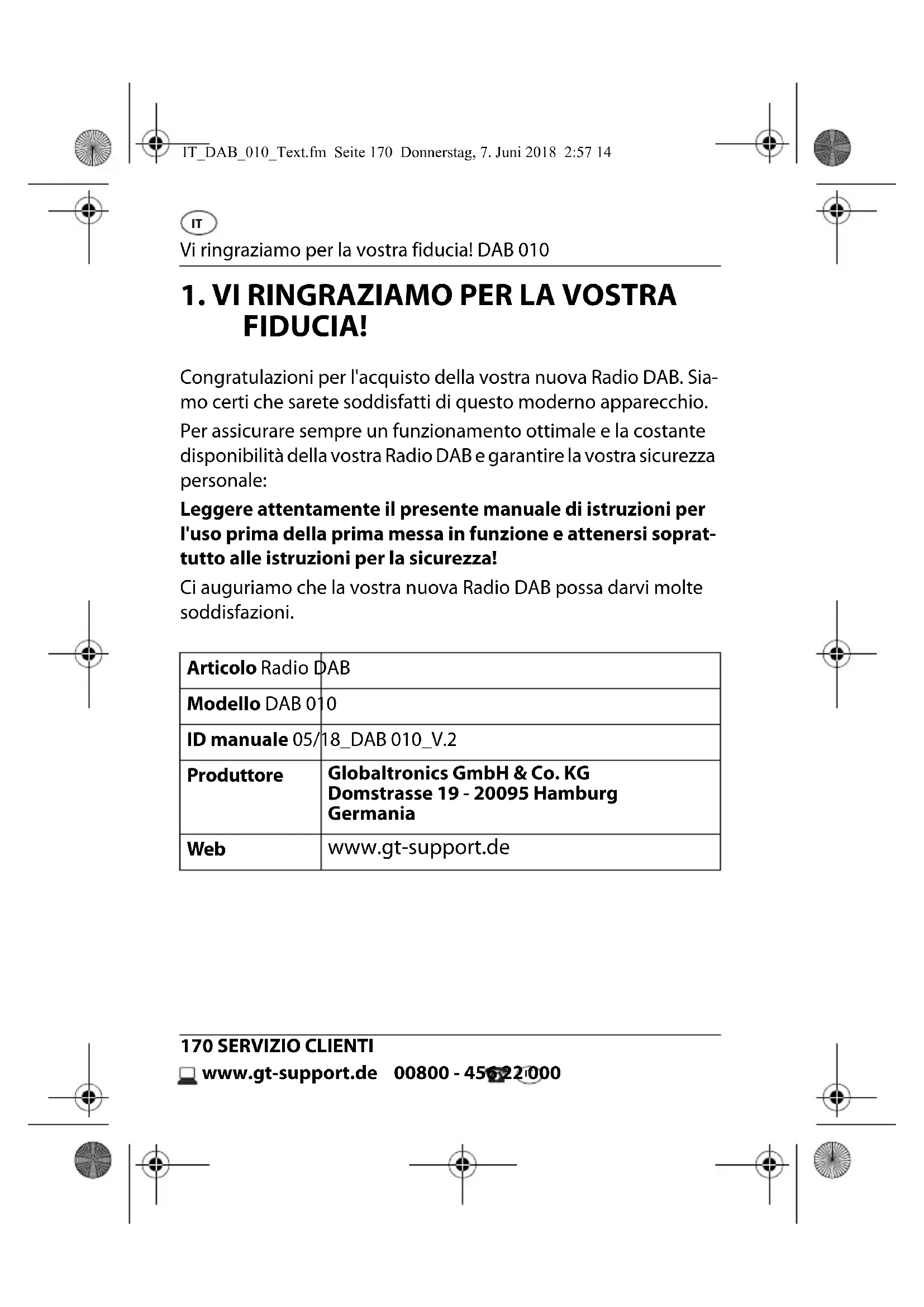 FIDUCIA! Congratulazioni per l'acquisto della vostra nuova Radio DAB. Sia- mo certi che sarete soddisfatti di questo moderno apparecchio. Per assicurare sempre un funzionamento ottimale e la costante disponibilità della vostra Radio DAB e garantire la vostra sicurezza personale: Leggere attentamente il presente manuale di istruzioni per l'uso prima della prima messa in funzione e attenersi soprat- tutto alle istruzioni per la sicurezza! Ci auguriamo che la vostra nuova Radio DAB possa darvi molte soddisfazioni. Articolo Radio DAB Modello DAB 010 ID manuale 05/18_DAB 010_V.2 Produttore Globaltronics GmbH & Co. KG Domstrasse 19 - 20095 Hamburg Germania Web www.gt-support.de IT_DAB_010_Text.fm Seite 170 Donnerstag, 7. Juni 2018 2:57 14SERVIZIO CLIENTI 171 Indicazioni generali