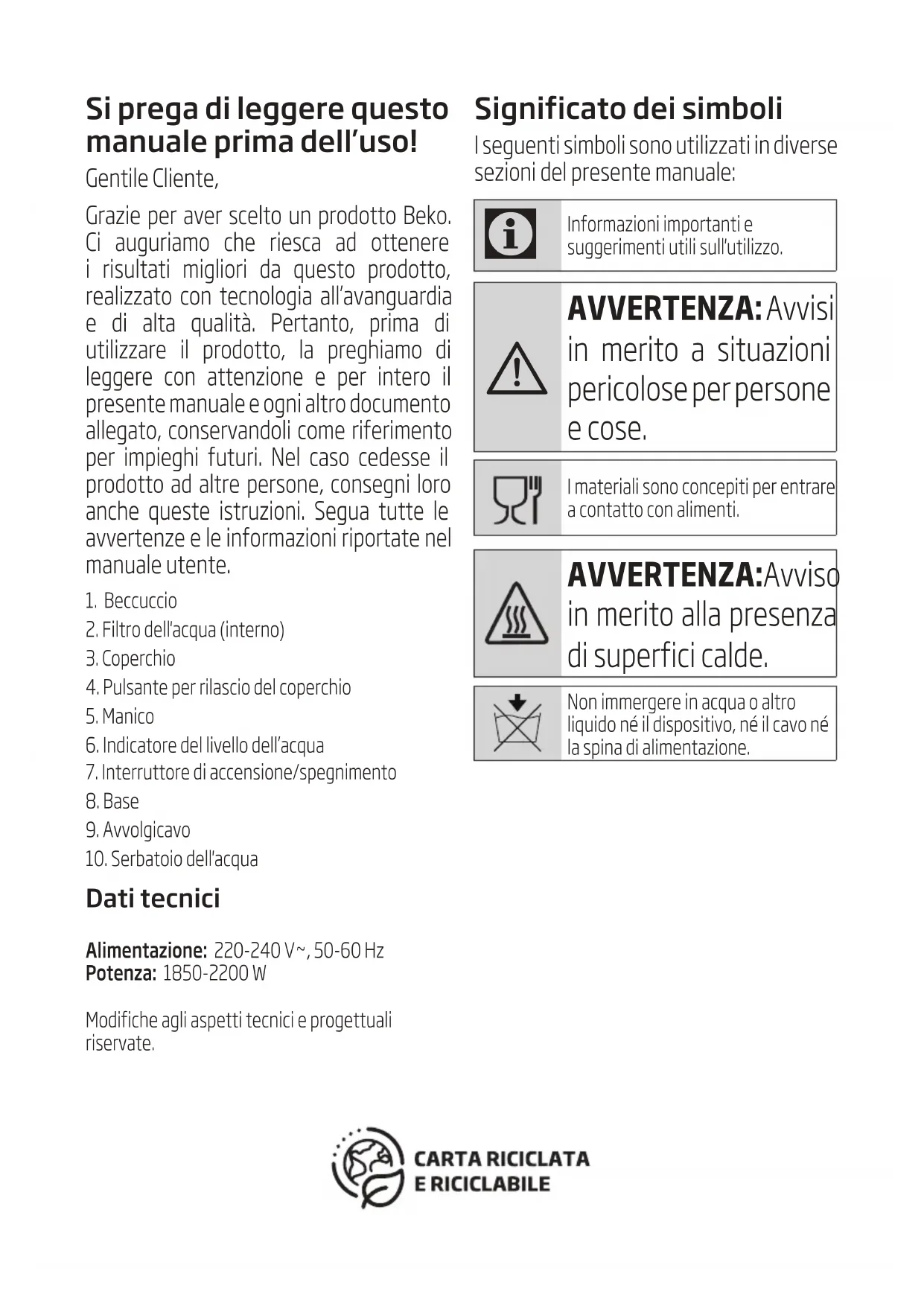 Prima di utilizzare il dispositivo dopo la pulizia, asciugare con cura ogni sua parte con un panno morbido.3.2 Decalcificazione del bollitoreLa rimozione del calcare estende la vita del bollitore. La frequenza varia a seconda del livello di durezza dell’acqua presente nella zona di impiego del dispositivo.1. Riempire il bollitore con acqua fino al livello massimo e portare a ebollizione. 2. Quando il dispositivo si spegne, scollegarlo dalla rete. 3. Aggiungere 2 tazze di aceto bianco o 1 cucchiaio di acido citrico dentro l’acqua appena bollita. 4. Lasciare la soluzione nel bollitore per alcune ore. 5. In seguito, gettarne il contenuto e sciacquare con cura l’interno del dispositivo. 6. Riempire il bollitore con acqua pulita e portare a ebollizione. 7. Infine, svuotare il bollitore e sciacquarlo nuovamente con acqua. Se si nota ancora del calcare residuo, ripetere la procedura. È anche possibile utilizzare un decalcificante appropriato per attrezzi da cucina. Se si usa un disincrostante, seguirne le istruzioni.3.3 Conservazione • Se non si intende utilizzare il dispositivo per un periodo prolungato, riporlo con cura. • Assicurarsi che l'apparecchio sia scollegato, freddo e completamente asciutto. • Conservare il dispositivo in un luogo fresco e asciutto. • Assicurarsi che si mantenga fuori dalla portata dei bambini. • Avvolgere il cavo di alimentazione intorno all’apposito avvolgicavo (9) posto sul fondo della base (8).3.4 Movimentazione e trasporto • Per la movimentazione e il trasporto del dispositivo, riporlo all’interno del suo imballaggio originale. L’imballo lo proteggerà contro eventuali danni materiali. • Non posizionare carichi pesanti sul dispositivo o il suo imballaggio. Potrebbe danneggiarsi. • Un’eventuale caduta del dispositivo potrebbe renderlo non funzionante o provocare dei danni permanenti.Per avvamento, uso generale e pulza, segure le struzon nelle pagne 4-5 d questo manuale operatvo.CERTIFICATO DI GARANZIA La presente garanzia commerciale si intende aggiuntiva e non sostitutiva di ogni altro diritto di cui gode il consumatore, inten- dendo per consumatore esclusivamente colui che utilizza il bene per scopi estranei all’attività imprenditoriale o professionale eventualmente svolta e pertanto per uso domestico/privato, e in particolare non pregiudica in alcun modo i dritti del consuma- tore stabiliti dal Dlgs 206/05. BEKO Italy S.r.l. in conformità alla facoltà prevista dalla legge, ore al consumatore una garanzia commerciale aggiuntiva, nei termini e nei modi di seguito indicati. Questo certicato non deve essere spedito per la convalida. E’ valido e operante solo se conservato assieme alla ricevuta scale o altro documento reso scalmente obbligatorio. Condizioni di Garanzia 1. BEKO Italy S.r.l. garantisce l’apparecchio per un periodo di 2 anni dalla data di acquisto (12 mesi se acquistato con fattura di vendita e non con scontrino scale). 2. La garanzia è valida esclusivamente sul territorio italiano compresa la Repubblica di San Marino e la città del Vaticano e deve essere comprovata da scontrino scale o fattura, che riporti il nominativo del Rivenditore, la data di acquisto dell’apparecchio nonché gli estremi i identicativi dello stesso (tipo, modello). 3. Per garanzia s’intende la sostituzione o riparazione gratuita delle parti componenti l’apparecchio che sono risultate difettose all’origine, per vizi di fabbricazione. 4. L’utente decade dai dritti di garanzia se non denuncia il difetto di conformità entro 2 mesi dalla scoperta dello stesso. 5. Diritto di Chiamata: gratuita per i primi 12 mesi di garanzia, a pagamento per gli altri 12 mesi nel caso l’utente non sia in grado di provare che il difetto sia dovuto a vizio di conformità del prodotto.