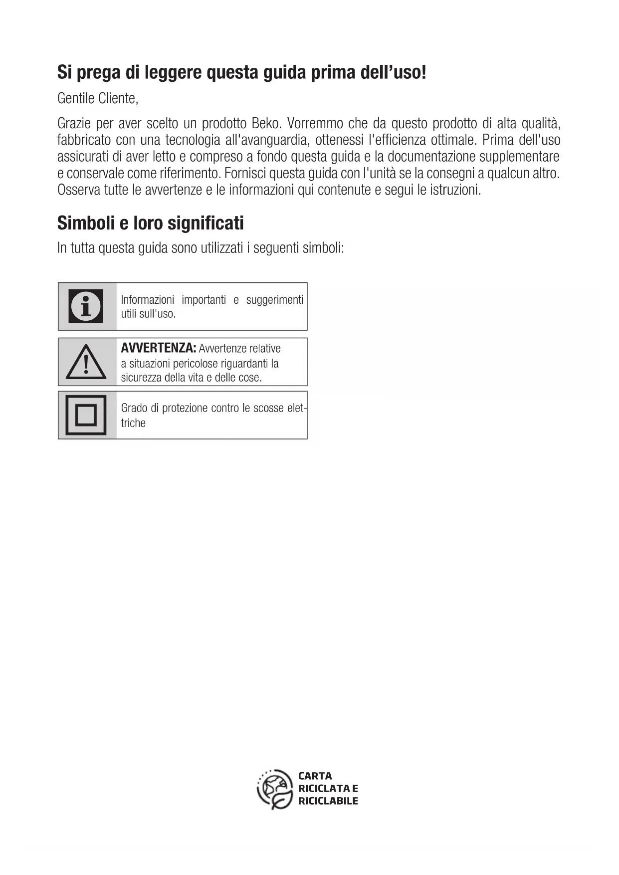 - Non appoggiare carichi pesanti sull'elettrodomestico o sull'imballaggio. In caso contrario, l’elettrodo- mestico si potrebbe danneggiare.• In caso di caduta, l'elettrodomestico potrebbe non funzionare o potrebbe subire danni permanenti.CERTIFICATO DI GARANZIA La presente garanzia commerciale si intende aggiuntiva e non sostitutiva di ogni altro diritto di cui gode il consumatore, inten- dendo per consumatore esclusivamente colui che utilizza il bene per scopi estranei all’attività imprenditoriale o professionale eventualmente svolta e pertanto per uso domestico/privato, e in particolare non pregiudica in alcun modo i dritti del consuma- commerciale aggiuntiva, nei termini e nei modi di seguito indicati. Condizioni di Garanzia 1. BEKO Italy S.r.l. garantisce l’apparecchio per un periodo di 2 anni dalla data di acquisto (12 mesi se acquistato con fattura di 2. La garanzia è valida esclusivamente sul territorio italiano compresa la Repubblica di San Marino e la città del Vaticano e deve 3. Per garanzia s’intende la sostituzione o riparazione gratuita delle parti componenti l’apparecchio che sono risultate difettose all’origine, per vizi di fabbricazione. 4. L’utente decade dai diritti di garanzia se non denuncia il difetto di conformità entro 2 mesi dalla scoperta dello stesso. 5. Diritto di Chiamata: gratuita per i primi 12 mesi di garanzia, a pagamento per gli altri 12 mesi nel caso l’utente non sia in grado di provare che il difetto sia dovuto a vizio di conformità del prodotto.