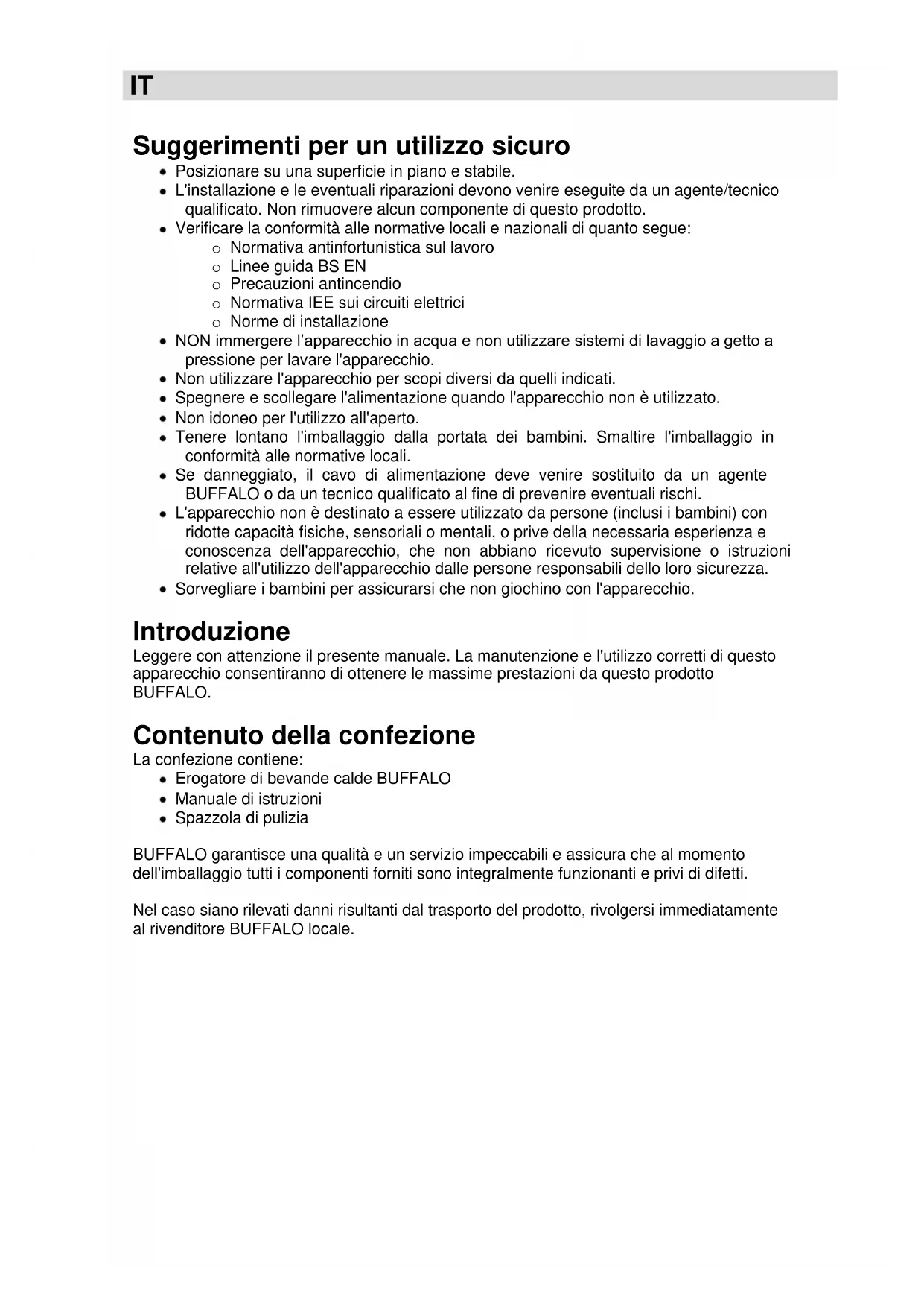 Suggerimenti per un utilizzo sicuro Posizionare su una superficie in piano e stabile. L'installazione e le eventuali riparazioni devono venire eseguite da un agente/tecnico qualificato. Non rimuovere alcun componente di questo prodotto. Verificare la conformità alle normative locali e nazionali di quanto segue: o Normativa antinfortunistica sul lavoro o Linee guida BS EN o Precauzioni antincendio o Normativa IEE sui circuiti elettrici o Norme di installazione NON immergere l’apparecchio in acqua e non utilizzare sistemi di lavaggio a getto a pressione per lavare l'apparecchio. Non utilizzare l'apparecchio per scopi diversi da quelli indicati. Spegnere e scollegare l'alimentazione quando l'apparecchio non è utilizzato. Non idoneo per l'utilizzo all'aperto. Tenere lontano l'imballaggio dalla portata dei bambini. Smaltire l'imballaggio in conformità alle normative locali. Se danneggiato, il cavo di alimentazione deve venire sostituito da un agente BUFFALO o da un tecnico qualificato al fine di prevenire eventuali rischi. L'apparecchio non è destinato a essere utilizzato da persone (inclusi i bambini) con ridotte capacità fisiche, sensoriali o mentali, o prive della necessaria esperienza e conoscenza dell'apparecchio, che non abbiano ricevuto supervisione o istruzioni relative all'utilizzo dell'apparecchio dalle persone responsabili dello loro sicurezza. Sorvegliare i bambini per assicurarsi che non giochino con l'apparecchio. Introduzione Leggere con attenzione il presente manuale. La manutenzione e l'utilizzo corretti di questo apparecchio consentiranno di ottenere le massime prestazioni da questo prodotto BUFFALO. Contenuto della confezione La confezione contiene: Erogatore di bevande calde BUFFALO Manuale di istruzioni Spazzola di pulizia BUFFALO garantisce una qualità e un servizio impeccabili e assicura che al momento dell'imballaggio tutti i componenti forniti sono integralmente funzionanti e privi di difetti. Nel caso siano rilevati danni risultanti dal trasporto del prodotto, rivolgersi immediatamente al rivenditore BUFFALO locale.IT