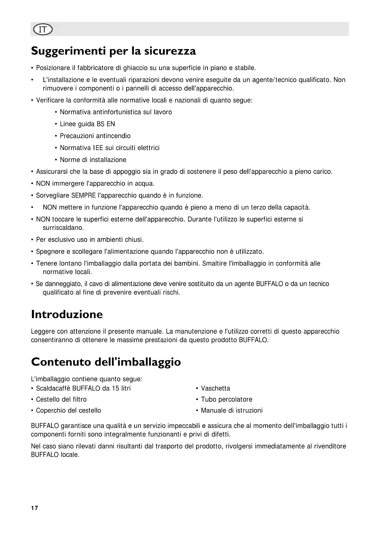 - Filo di terra (colore verde/giallo) a terminale E L'apparecchio deve avere un circuito dedicato di messa a terra. In caso di dubbi, consultare un elettricista qualificato. I punti di isolamento elettrico devono essere liberi da ostruzioni. In caso di emergenza, i punti devono essere facilmente raggiungibili qualora sia necessario scollegarli. Conformità I componenti BUFFALO sono stati sottoposti a un rigoroso collaudo ai fini della conformità agli standard e alle specifiche normative previste dalle autorità internazionali, indipendenti e federali. I prodotti BUFFALO sono stati autorizzati a esporre il seguente simbolo: Tutti i diritti riservati. È vietata la riproduzione o la trasmissione in alcuna forma, elettronica, meccanica, mediante fotocopiatura o altro sistema di riproduzione, di qualsiasi parte delle presenti istruzioni senza la previa autorizzazione scritta di BUFFALO. Le informazioni contenute sono corrette e accurate al momento della stampa, tuttavia BUFFALO si riserva il diritto di modificare le specifiche senza preavviso. Modello Tensione Alimentazio Corrente Capacità Peso (a pieno carico) Tempo di preparazione (a pieno carico) Dimensioni h x l x p mm F249 230V 50Hz 1500W 6,5A 15 litri (100 tazze) 20 kg circa 60 minuti circa 530 x 360 x