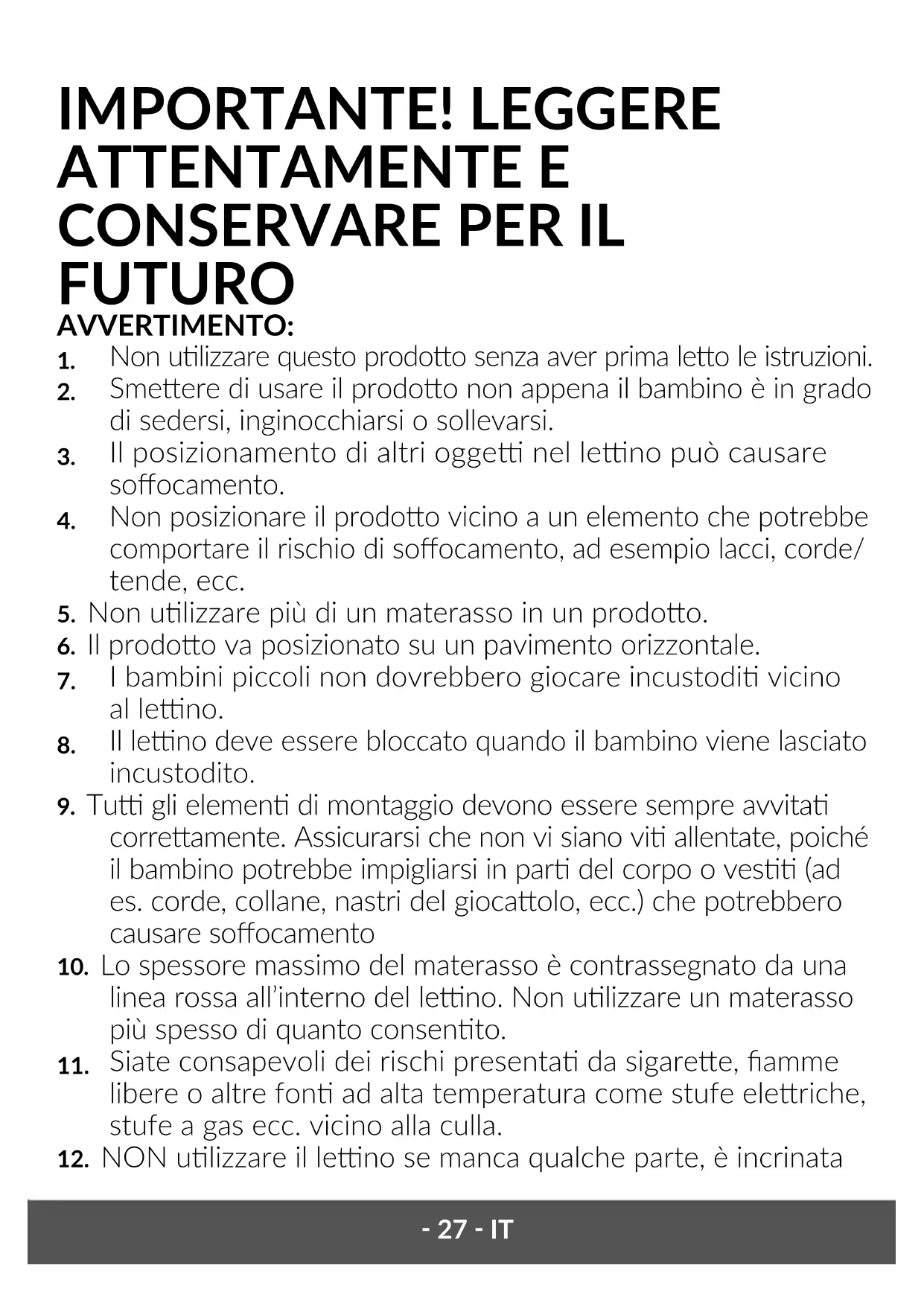 o danneggiata. Se necessario, contaare Lionelo per pezzi di ricambio e istruzioni. NON cambiare le par nel leno da soli. AVVERTENZE per materasso: