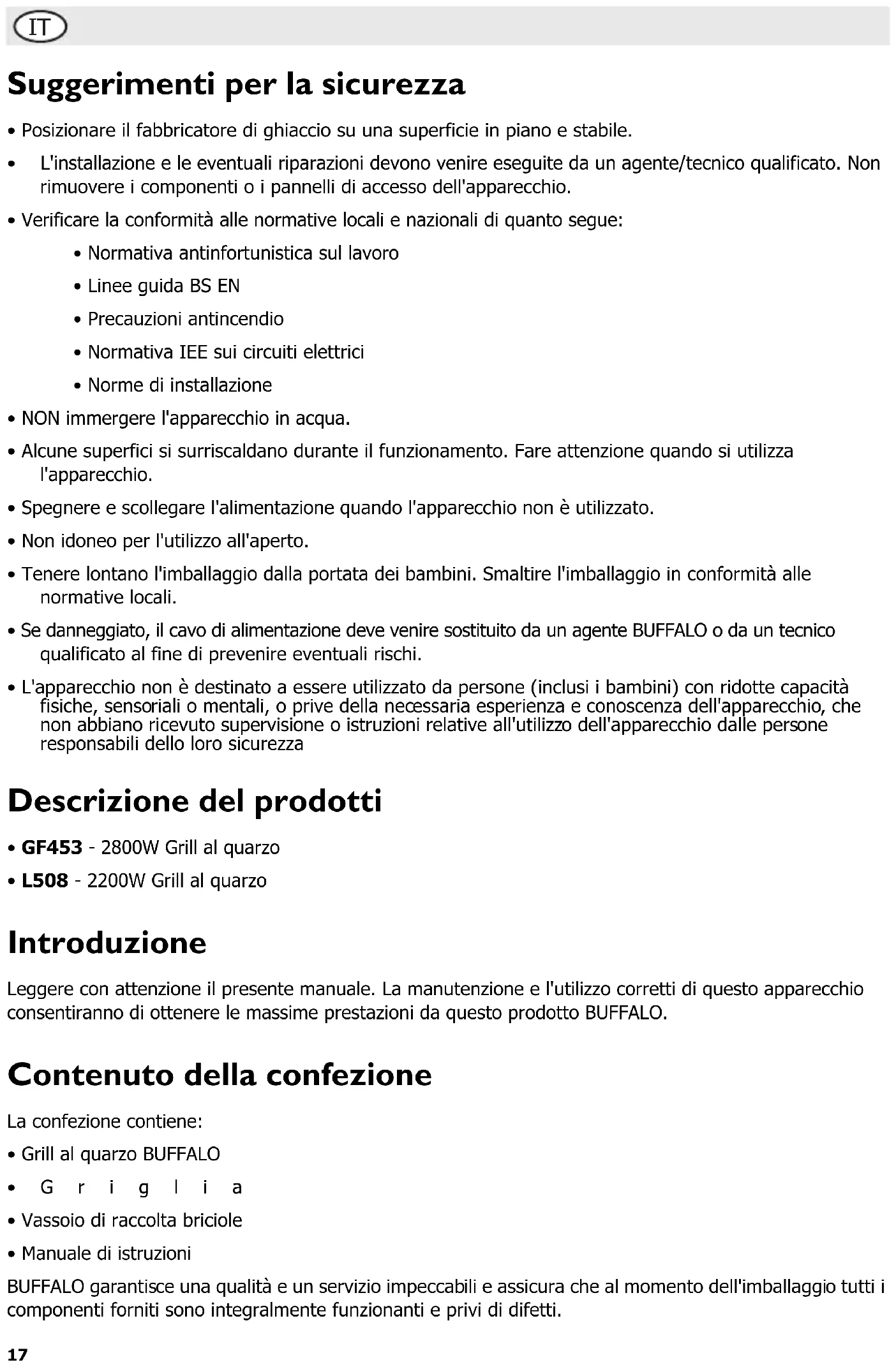 - L508 - 2200W Grill al quarzo Introduzione Leggere con attenzione il presente manuale. La manutenzione e l'utilizzo corretti di questo apparecchio consentiranno di ottenere le massime prestazioni da questo prodotto BUFFALO. Contenuto della confezione La confezione contiene: