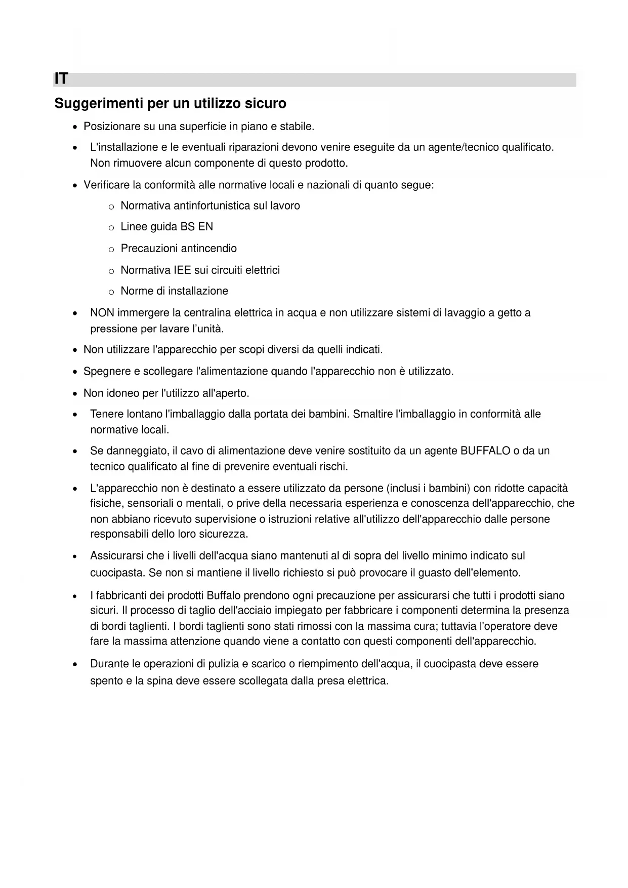 Tous droits réservés. Il est interdit de reproduire ou transmettre tout ou partie de la présente notice sous quelque forme ou moyen, électronique ou mécanique que ce soit, y compris par la photocopie, l'enregistrement ou autre, sans l'autorisation écrite préalable de BUFFALO. Tous les efforts ont été faits pour que ces informations soient correctes au moment de l'impression, toutefois, BUFFALO se réserve le droit de modifier les spécifications sans avertissement préalable.IT Suggerimenti per un utilizzo sicuro Posizionare su una superficie in piano e stabile. L'installazione e le eventuali riparazioni devono venire eseguite da un agente/tecnico qualificato. Non rimuovere alcun componente di questo prodotto. Verificare la conformità alle normative locali e nazionali di quanto segue: o Normativa antinfortunistica sul lavoro o Linee guida BS EN o Precauzioni antincendio o Normativa IEE sui circuiti elettrici o Norme di installazione NON immergere la centralina elettrica in acqua e non utilizzare sistemi di lavaggio a getto a pressione per lavare l’unità. Non utilizzare l'apparecchio per scopi diversi da quelli indicati. Spegnere e scollegare l'alimentazione quando l'apparecchio non è utilizzato. Non idoneo per l'utilizzo all'aperto. Tenere lontano l'imballaggio dalla portata dei bambini. Smaltire l'imballaggio in conformità alle normative locali. Se danneggiato, il cavo di alimentazione deve venire sostituito da un agente BUFFALO o da un tecnico qualificato al fine di prevenire eventuali rischi. L'apparecchio non è destinato a essere utilizzato da persone (inclusi i bambini) con ridotte capacità fisiche, sensoriali o mentali, o prive della necessaria esperienza e conoscenza dell'apparecchio, che non abbiano ricevuto supervisione o istruzioni relative all'utilizzo dell'apparecchio dalle persone responsabili dello loro sicurezza. Assicurarsi che i livelli dell'acqua siano mantenuti al di sopra del livello minimo indicato sul cuocipasta. Se non si mantiene il livello richiesto si può provocare il guasto dell'elemento. I fabbricanti dei prodotti Buffalo prendono ogni precauzione per assicurarsi che tutti i prodotti siano sicuri. Il processo di taglio dell'acciaio impiegato per fabbricare i componenti determina la presenza di bordi taglienti. I bordi taglienti sono stati rimossi con la massima cura; tuttavia l'operatore deve fare la massima attenzione quando viene a contatto con questi componenti dell'apparecchio. Durante le operazioni di pulizia e scarico o riempimento dell'acqua, il cuocipasta deve essere spento e la spina deve essere scollegata dalla presa elettrica.IT Introduzione Grazie per avere acquistato il Cuocipasta elettrico Buffalo. Prima di mettere in funzione il prodotto, leggere le istruzioni nel presente manuale per utilizzare in maniera efficiente e priva di problemi l'apparecchio. Conservare le istruzioni in un luogo sicuro come riferimento futuro. Buffalo declina ogni responsabilità per i guasti dell'apparecchio nei seguenti casi: Le istruzioni del manuale non sono state seguite correttamente. Il cuocipasta è stato regolato da personale non qualificato o non autorizzato. Sono state utilizzate parti di ricambio non originali. Il cuocipasta non è stato manipolato e pulito correttamente. Il cuocipasta è stato utilizzato per uno scopo diverso da quello indicato.