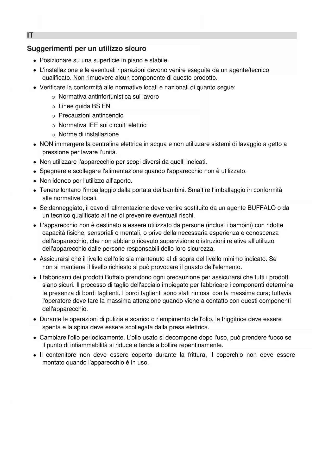 Alle Rechte vorbehalten. Diese Anleitung darf ohne vorherige schriftliche Erlaubnis von BUFFALO weder ganz noch auszugsweise in irgendeiner Form und auf irgendeinem Wege – ob elektronisch, mechanisch, durch Fotokopieren oder anderweitig – vervielfältigt oder übertragen werden. Es werden alle Anstrengungen unternommen um sicherzustellen, dass alle Angaben bei Drucklegung korrekt sind. BUFFALO behält sich jedoch das Recht vor, Spezifikationen ohne Vorankündigung zu ändern.IT Suggerimenti per un utilizzo sicuro Posizionare su una superficie in piano e stabile. L'installazione e le eventuali riparazioni devono venire eseguite da un agente/tecnico qualificato. Non rimuovere alcun componente di questo prodotto. Verificare la conformità alle normative locali e nazionali di quanto segue: o Normativa antinfortunistica sul lavoro o Linee guida BS EN o Precauzioni antincendio o Normativa IEE sui circuiti elettrici o Norme di installazione NON immergere la centralina elettrica in acqua e non utilizzare sistemi di lavaggio a getto a pressione per lavare l’unità. Non utilizzare l'apparecchio per scopi diversi da quelli indicati. Spegnere e scollegare l'alimentazione quando l'apparecchio non è utilizzato. Non idoneo per l'utilizzo all'aperto. Tenere lontano l'imballaggio dalla portata dei bambini. Smaltire l'imballaggio in conformità alle normative locali. Se danneggiato, il cavo di alimentazione deve venire sostituito da un agente BUFFALO o da un tecnico qualificato al fine di prevenire eventuali rischi. L'apparecchio non è destinato a essere utilizzato da persone (inclusi i bambini) con ridotte capacità fisiche, sensoriali o mentali, o prive della necessaria esperienza e conoscenza dell'apparecchio, che non abbiano ricevuto supervisione o istruzioni relative all'utilizzo dell'apparecchio dalle persone responsabili dello loro sicurezza. Assicurarsi che il livello dell'olio sia mantenuto al di sopra del livello minimo indicato. Se non si mantiene il livello richiesto si può provocare il guasto dell'elemento. I fabbricanti dei prodotti Buffalo prendono ogni precauzione per assicurarsi che tutti i prodotti siano sicuri. Il processo di taglio dell'acciaio impiegato per fabbricare i componenti determina la presenza di bordi taglienti. I bordi taglienti sono stati rimossi con la massima cura; tuttavia l'operatore deve fare la massima attenzione quando viene a contatto con questi componenti dell'apparecchio. Durante le operazioni di pulizia e scarico o riempimento dell'olio, la friggitrice deve essere spenta e la spina deve essere scollegata dalla presa elettrica. Cambiare l'olio periodicamente. L'olio usato si decompone dopo l'uso, può prendere fuoco se il punto di infiammabilità si riduce e tende a bollire repentinamente. Il contenitore non deve essere coperto durante la frittura, il coperchio non deve essere montato quando l'apparecchio è in uso.IT Introduzione Grazie per avere acquistato la Friggitrice elettrica Buffalo. Prima di mettere in funzione il prodotto, leggere le istruzioni e le indicazioni contenute in questo manuale per utilizzare in maniera efficiente e priva di problemi l'apparecchio. Conservare le istruzioni in un luogo sicuro come riferimento futuro. Questi apparecchi sono destinati all'utilizzo commerciale, ad esempio in ristoranti, mense, ospedali ed esercizi commerciali quali panetterie, macellerie e così via ma non per la produzione continua di grandi quantità di cibi. Buffalo declina ogni responsabilità per i guasti dell'apparecchio nei seguenti casi: Le istruzioni del manuale non sono state seguite correttamente. La friggitrice è stata regolata da personale non qualificato o non autorizzato. Sono state utilizzate parti di ricambio non originali. La friggitrice non è stata manipolata e pulita correttamente. La friggitrice è stata utilizzata per uno scopo diverso da quello indicato.