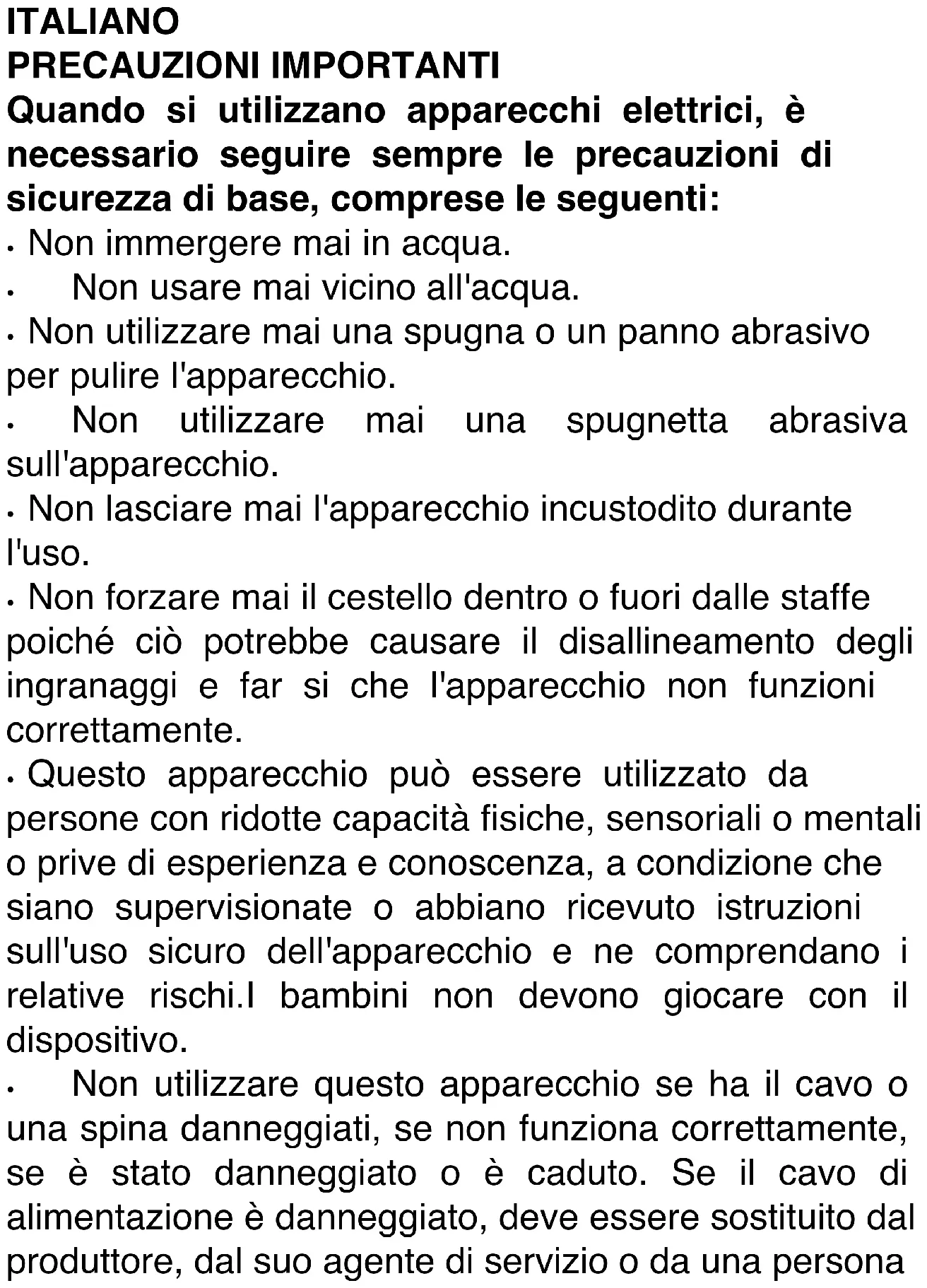 - Non utilizzare questo apparecchio se ha il cavo o una spina danneggiati, se non funziona correttamente, se è stato danneggiato o è caduto. Se il cavo di alimentazione è danneggiato, deve essere sostituito dal produttore, dal suo agente di servizio o da una personasimilmente qualificata per evitare rischi.