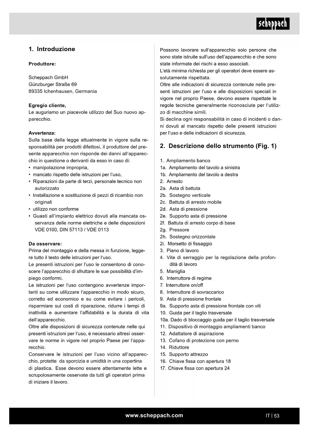 Da osservare: Prima del montaggio e della messa in funzione, legge- re tutto il testo delle istruzioni per l‘uso. Le presenti istruzioni per l’uso le consentono di cono- scere l’apparecchio di sfruttare le sue possibilità d’im- piego conformi. Le istruzioni per l‘uso contengono avvertenze impor- tanti su come utilizzare l‘apparecchio in modo sicuro, corretto ed economico e su come evitare i pericoli, risparmiare sui costi di riparazione, ridurre i tempi di inattività e aumentare l‘adabilità e la durata di vita dell‘apparecchio. Oltre alle disposizioni di sicurezza contenute nelle qui presenti istruzioni per l‘uso, è necessario altresì osser- vare le norme in vigore nel proprio Paese per l‘appa- recchio. Conservare le istruzioni per l’uso vicino all‘apparec- chio, protette da sporcizia e umidità in una copertina di plastica. Esse devono essere attentamente lette e scrupolosamente osservate da tutti gli operatori prima di iniziare il lavoro.www.scheppach.com