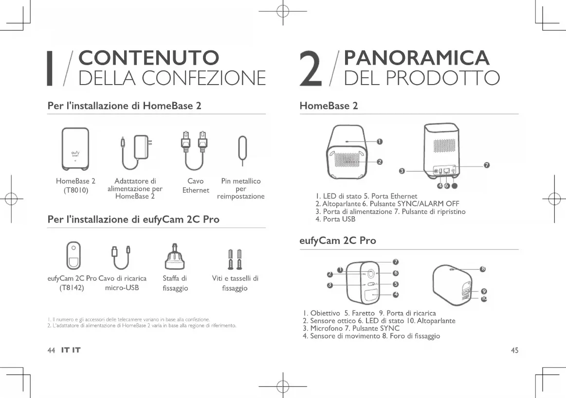 CONTENUTO DELLA CONFEZIONE Per l'installazione di HomeBase 2 HomeBase 2 (T8010) Adattatore di alimentazione per HomeBase 2 Cavo Ethernet Pin metallico per reimpostazione Per l'installazione di eufyCam 2C Pro eufyCam 2C Pro (T8142) Cavo di ricarica micro-USB Staffa di ssaggio Viti e tasselli di ssaggio