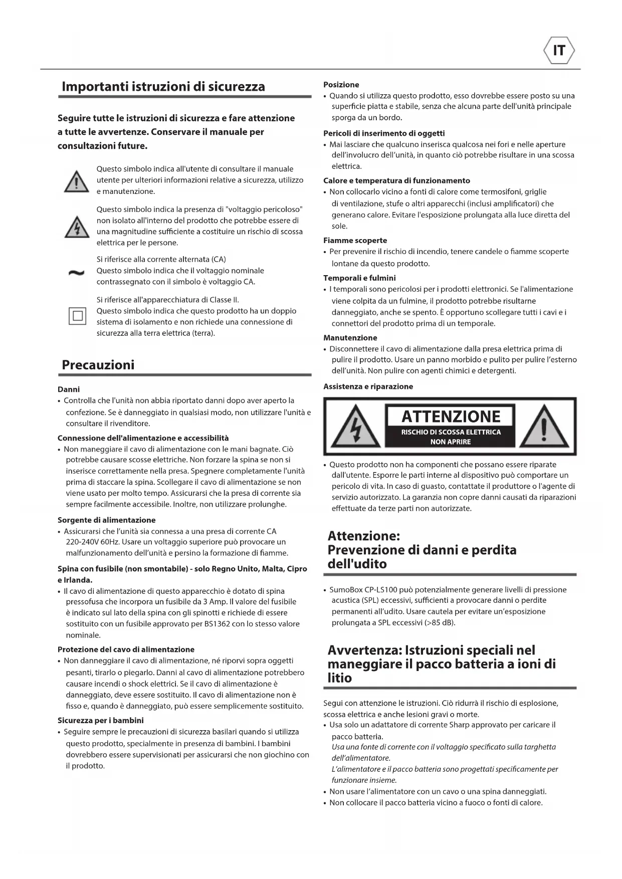 - SumoBox CP-LS100 può potenzialmente generare livelli di pressione acustica (SPL) eccessivi, sucienti a provocare danni o perdite permanenti all’udito. Usare cautela per evitare un’esposizione prolungata a SPL eccessivi (>85 dB). Avvertenza: Istruzioni speciali nel maneggiare il pacco batteria a ioni di litio Segui con attenzione le istruzioni. Ciò ridurrà il rischio di esplosione, scossa elettrica e anche lesioni gravi o morte.• Usa solo un adattatore di corrente Sharp approvato per caricare il pacco batteria.Usa una fonte di corrente con il voltaggio specicato sulla targhetta dell’alimentatore.L’alimentatore e il pacco batteria sono progettati specicamente per funzionare insieme.• Non usare l’alimentatore con un cavo o una spina danneggiati.• Non collocare il pacco batteria vicino a fuoco o fonti di calore. CAUTION