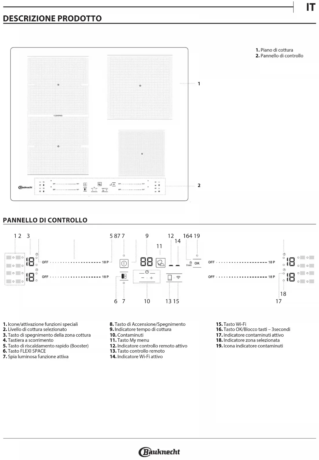 1. Icone/attivazione funzioni speciali2. Livello di cottura selezionato3. Tasto di spegnimento della zona cottura4. Tastiera a scorrimento5. Tasto di riscaldamento rapido (Booster)6. Tasto FLEXI SPACE7. Spia luminosa funzione attiva8. Tasto di Accensione/Spegnimento9. Indicatore tempo di cottura10. Contaminuti11. Tasto Mymenu12. Indicatore controllo remoto attivo13. Tasto controllo remoto14. Indicatore Wi-Fi attivo15. Tasto Wi-Fi16. Tasto OK/Blocco tasti – 3secondi17. Indicatore contaminuti attivo18. Indicatore zona selezionata19. Icona indicatore contaminuti