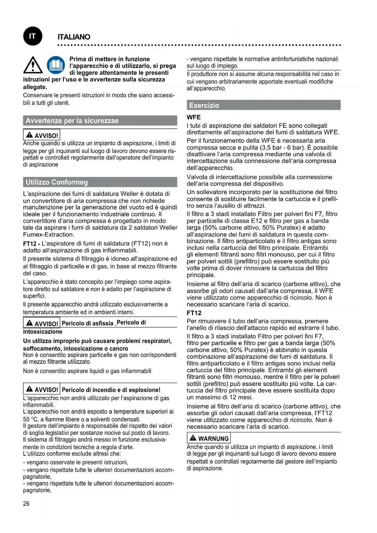 FRANÇAIS Symboles Attention ! Lire la notice d‘utilisation ! Design et poste de travail conformes ESD Risque d‘écrasement Elimination des déchets Les déchets d’équipements électriques et élect- roniques doivent être collectés et éliminer séparé- ment. Retirez les ampoules des appareils avant de les jeter. S‘adresser aux autorités locales ou au détaillant spécialisé en vue de connaître l‘emplacement des centres de recyclage et des points de collecte. Selon les réglementations locales, les détaillants peuvent être tenus de reprendre gratuitement les déchets de piles et les déchets d’équipements électriques et électro- niques. Contribuez à réduire la demande de matières premières en réutilisant et en recyclant vos déchets d’équipements électriques et électro- niques. Les déchets d’équipements électriques et électroniques comportent des matériaux précieux et recyclables qui peuvent avoir des impacts négatifs sur l’environnement et sur votre santé s’ils ne sont pas éliminés de manière écologique. Avant de mettre au rebut votre ancien appareil, supprimez les données personnelles qui pourrai- ent s’y trouver. Des ltres colmatés doivent être traités comme déchets spéciaux. Eliminez les pièces de l‘appareil remplacées, les ltres ou les vieux appareils selon les consignes en vigueur dans votre pays. Des ltres colmatés doivent être traités comme déchets spéciaux. Signe CE Marque de conformité britannique26 Prima di mettere in funzione l‘apparecchio e di utilizzarlo, si prega di leggere attentamente le presenti istruzioni per l‘uso e le avvertenze sulla sicurezza allegate. Conservare le presenti istruzioni in modo che siano accessi- bili a tutti gli utenti. Avvertenze per la sicurezzae AVVISO! Anche quando si utilizza un impianto di aspirazione, i limiti di legge per gli inquinanti sul luogo di lavoro devono essere ris- pettati e controllati regolarmente dall‘operatore dell’impianto di aspirazione Utilizzo Conformeg L’aspirazione dei fumi di saldatura Weller è dotata di un convertitore di aria compressa che non richiede manutenzione per la generazione del vuoto ed è quindi ideale per il funzionamento industriale continuo. Il convertitore d‘aria compressa è progettato in modo tale da aspirare i fumi di saldatura da 2 saldatori Weller Fumex-Extraction. FT12 - L‘aspiratore di fumi di saldatura (FT12) non è adatto all‘aspirazione di gas inammabili. Il presente sistema di ltraggio è idoneo all‘aspirazione ed al ltraggio di particelle e di gas, in base al mezzo ltrante del caso. L‘apparecchio è stato concepito per l‘impiego come aspira- tore diretto sul saldatore e non è adatto per l‘aspirazione di superci. Il presente apparecchio andrà utilizzato esclusivamente a temperatura ambiente ed in ambienti interni. AVVISO! Pericolo di asssia , Pericolo di intossicazione Un utilizzo improprio può causare problemi respiratori, soffocamento, intossicazione o cancro Non è consentito aspirare particelle e gas non corrispondenti al mezzo ltrante utilizzato Non è consentito aspirare liquidi o gas inammabili AVVISO! Pericolo di incendio e di esplosione! L‘apparecchio non andrà utilizzato per l‘aspirazione di gas inammabili. L‘apparecchio non andrà esposto a temperature superiori ai 50 °C, a amme libere o a solventi condensati. Il gestore dell‘impianto è responsabile del rispetto dei valori di soglia legislativi per sostanze nocive sul posto di lavoro. Il sistema di ltraggio andrà messo in funzione esclusiva- mente in condizioni tecniche a regola d‘arte. L‘utilizzo conforme esclude altresì che: - vengano osservate le presenti istruzioni, - vengano rispettate tutte le ulteriori documentazioni accom- pagnatorie, - vengano rispettate tutte le ulteriori documentazioni accom- pagnatorie, - vengano rispettate le normative antinfortunistiche nazionali sul luogo di impiego. Il produttore non si assume alcuna responsabilità nel caso in cui vengano arbitrariamente apportate eventuali modiche all‘apparecchio. Esercizio WFE I tubi di aspirazione dei saldatori FE sono collegati direttamente all‘aspirazione dei fumi di saldatura WFE. Per il funzionamento della WFE è necessaria aria compressa secca e pulita (3,5 bar - 6 bar). È possibile disattivare l‘aria compressa mediante una valvola di intercettazione sulla connessione dell‘aria compressa dell’apparecchio. Valvola di intercettazione possibile alla connessione dell‘aria compressa del dispositivo. Un sollevatore incorporato per la sostituzione del ltro consente di sostituire facilmente la cartuccia e il prel- tro senza l‘ausilio di attrezzi. Il ltro a 3 stadi installato Filtro per polveri ni F7, ltro per particelle di classe E12 e ltro per gas a banda larga (50% carbone attivo, 50% Puratex) è adatto all‘aspirazione dei fumi di saldatura in questa com- binazione. Il ltro antiparticolato e il ltro antigas sono inclusi nella cartuccia del ltro principale. Entrambi gli elementi ltranti sono ltri monouso, per cui il ltro per polveri sottili (preltro) può essere sostituito più volte prima di dover rinnovare la cartuccia del ltro principale. Insieme al ltro dell‘aria di scarico (carbone attivo), che assorbe gli odori causati dall‘aria compressa, il WFE viene utilizzato come apparecchio di ricircolo. Non è necessario scaricare l‘aria di scarico. FT12 Per rimuovere il tubo dell‘aria compressa, premere l‘anello di rilascio dell‘attacco rapido ed estrarre il tubo. Il ltro a 3 stadi installato Filtro per polveri ni F7, ltro per particelle e ltro per gas a banda larga (50% carbone attivo, 50% Puratex) è abbinato in questa combinazione all‘aspirazione dei fumi di saldatura. Il ltro antiparticolato e il ltro antigas sono inclusi nella cartuccia del ltro principale. Entrambi gli elementi ltranti sono ltri monouso, mentre il ltro per le polveri sottili (preltro) può essere sostituito più volte. La car- tuccia del ltro principa