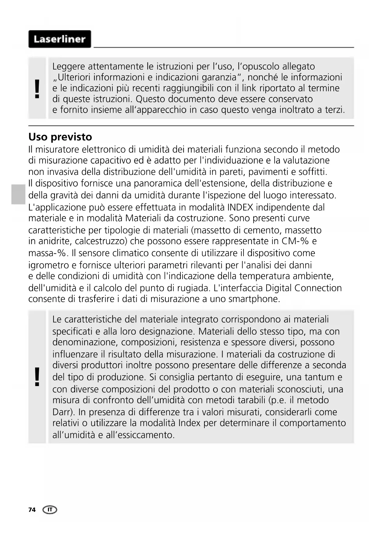 Uso previsto Il misuratore elettronico di umidità dei materiali funziona secondo il metodo di misurazione capacitivo ed è adatto per l'individuazione e la valutazione non invasiva della distribuzione dell'umidità in pareti, pavimenti e softti. Il dispositivo fornisce una panoramica dell'estensione, della distribuzione e della gravità dei danni da umidità durante l'ispezione del luogo interessato. L'applicazione può essere effettuata in modalità INDEX indipendente dal materiale e in modalità Materiali da costruzione. Sono presenti curve caratteristiche per tipologie di materiali (massetto di cemento, massetto in anidrite, calcestruzzo) che possono essere rappresentate in CM-% e massa-%. Il sensore climatico consente di utilizzare il dispositivo come igrometro e fornisce ulteriori parametri rilevanti per l'analisi dei danni e delle condizioni di umidità con l'indicazione della temperatura ambiente, dell'umidità e il calcolo del punto di rugiada. L'interfaccia Digital Connection consente di trasferire i dati di misurazione a uno smartphone. Leggere attentamente le istruzioni per l‘uso, l’opuscolo allegato „Ulteriori informazioni e indicazioni garanzia“, nonché le informazioni e le indicazioni più recenti raggiungibili con il link riportato al termine di queste istruzioni. Questo documento deve essere conservato e fornito insieme all‘apparecchio in caso questo venga inoltrato a terzi.