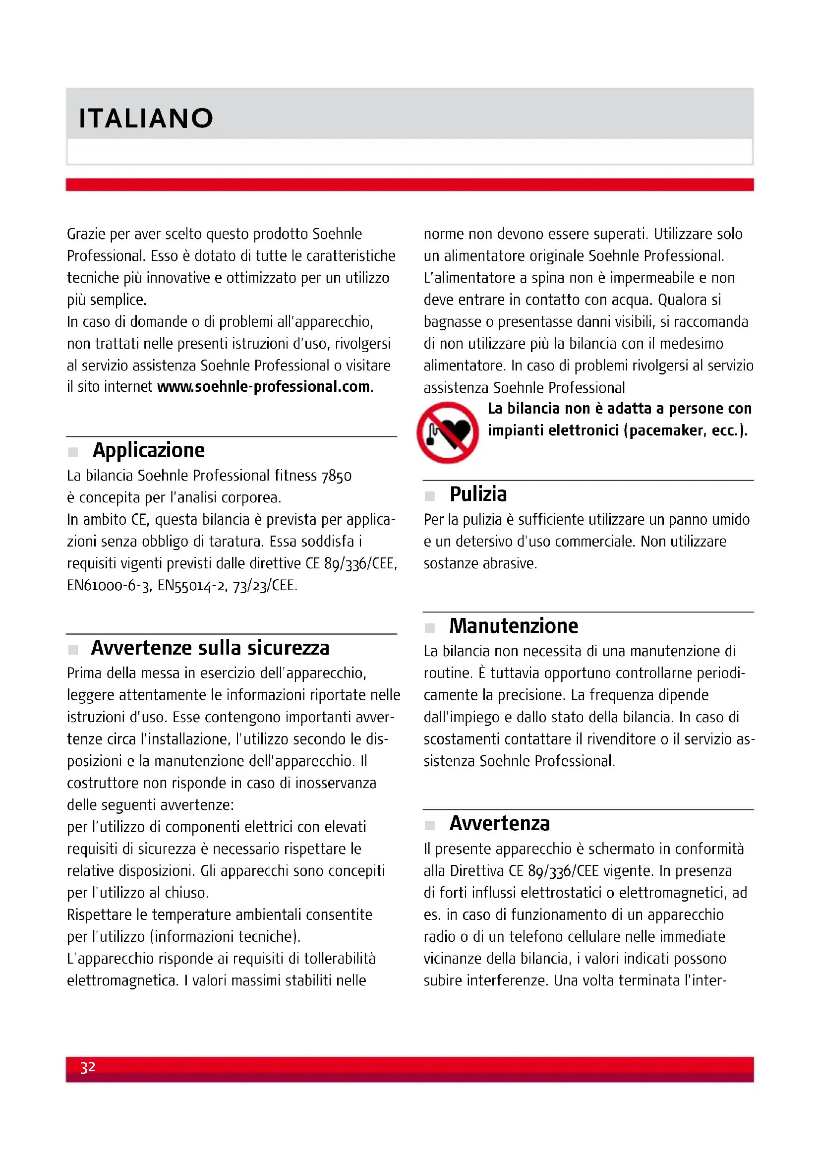 Pour quitter le programme « ScaleManager »32 ITALIANO Grazie per aver scelto questo prodotto Soehnle Professional. Esso è dotato di tutte le caratteristiche tecniche più innovative e ottimizzato per un utilizzo più semplice. In caso di domande o di problemi all’apparecchio, non trattati nelle presenti istruzioni d’uso, rivolgersi al servizio assistenza Soehnle Professional o visitare il sito internet www.soehnle-professional.com. ■ Applicazione La bilancia Soehnle Professional fitness 7850 è concepita per l’analisi corporea. In ambito CE, questa bilancia è prevista per applica- zioni senza obbligo di taratura. Essa soddisfa i requisiti vigenti previsti dalle direttive CE 89/336/CEE, EN61000-6-3, EN55014-2, 73/23/CEE. ■ Avvertenze sulla sicurezza Prima della messa in esercizio dell'apparecchio, leggere attentamente le informazioni riportate nelle istruzioni d'uso. Esse contengono importanti avver- tenze circa l'installazione, l'utilizzo secondo le dis- posizioni e la manutenzione dell'apparecchio. Il costruttore non risponde in caso di inosservanza delle seguenti avvertenze: per l’utilizzo di componenti elettrici con elevati requisiti di sicurezza è necessario rispettare le relative disposizioni. Gli apparecchi sono concepiti per l'utilizzo al chiuso. Rispettare le temperature ambientali consentite per l'utilizzo (informazioni tecniche). L'apparecchio risponde ai requisiti di tollerabilità elettromagnetica. I valori massimi stabiliti nelle norme non devono essere superati. Utilizzare solo un alimentatore originale Soehnle Professional. L’alimentatore a spina non è impermeabile e non deve entrare in contatto con acqua. Qualora si bagnasse o presentasse danni visibili, si raccomanda di non utilizzare più la bilancia con il medesimo alimentatore. In caso di problemi rivolgersi al servizio assistenza Soehnle Professional La bilancia non è adatta a persone con impianti elettronici (pacemaker, ecc.). ■ Pulizia Per la pulizia è sufficiente utilizzare un panno umido e un detersivo d'uso commerciale. Non utilizzare sostanze abrasive. ■ Manutenzione La bilancia non necessita di una manutenzione di routine. È tuttavia opportuno controllarne periodi- camente la precisione. La frequenza dipende dall'impiego e dallo stato della bilancia. In caso di scostamenti contattare il rivenditore o il servizio as- sistenza Soehnle Professional. ■ Avvertenza Il presente apparecchio è schermato in conformità alla Direttiva CE 89/336/CEE vigente. In presenza di forti influssi elettrostatici o elettromagnetici, ad es. in caso di funzionamento di un apparecchio radio o di un telefono cellulare nelle immediate vicinanze della bilancia, i valori indicati possono subire interferenze. Una volta terminata l'inter-33 ITALIANO ferenza, il prodotto può essere utilizzato conforme- mente a quanto indicato nelle disposizioni; può rendersi necessaria la riaccensione. L'apparecchio è uno strumento di misura. Correnti d'aria, vibrazioni, bruschi sbalzi di temperatura e l'esposizione al sole possono interferire con i risultati della pesata. La bilancia soddisfa il livello di protezione IP 54. Evitare di esporre la bilancia a elevata umidità, vapori, liquidi aggressivi e sporco resistente. ■ Garanzia/Responsabilità Nel caso in cui il prodotto fornito presenti un difetto attribuibile a Soehnle Professional, l’azienda si riserva di decidere l’eventuale eliminazione del difetto oppure la sostituzione del pezzo. Le parti sostituite diventano proprietà di Soehnle Professional. Qualora l’eliminazione del difetto o la sostituzione del pezzo fossero insufficienti, si applicano le dis– posizioni di legge. Il periodo di garanzia è di due anni e decorre dal giorno dell'acquisto. Si consiglia di conservare la ricevuta come prova. Per esigenze di manutenzione contattare il rivendi- tore o il centro di assistenza Soehnle Professional. Non viene riconosciuta alcuna garanzia per danni originati dalle cause seguenti: stoccaggio o utilizzo inappropriato o scorretto, mon- taggio e/o messa in funzione eseguiti dall'acquirente o da terzi in modo errato, usura naturale, modifiche o interventi, trattamento errato o negligente, utilizzo eccessivo, disturbi di tipo chimico, elettrochimico ed elettrico o dovuti a umidità, a meno che non siano attribuibili a Soehnle Professional. Nel caso in cui disturbi di natura ambientale o cli- matica dovessero portare a significative modifiche delle condizioni o dello stato dei materiali, la garanzia relativa al perfetto funzionamento complessivo dell'apparecchio decade. La garanzia fornita da Soehnle Professional nel singolo caso, si riferisce all'assenza di difetti nel prodotto fornito per la durata del periodo di garanzia. Conservare l'imballaggio originale per un eventuale trasporto in restituzione. ■ Smaltimento della bilancia Questo prodotto non deve essere trattato come rifiuto normale, ma deve essere consegnato a un punto di deposito per il riciclaggio di apparecchiature elettriche ed elettroniche. Ulteriori informazioni possono essere richieste al comune, alle aziende comunali di smaltimento o alla ditta dalla quale il prodotto è stato acquistato. ■ Ulteriori informazioni Per ulteriori informazioni e il software programma ScaleManager sotto: https://www.soehnle-professional.com/en/site/ documents Si prega di visitare il Centro clienti in linea www.soehnle-professional.com e scegliere tra Download Bilance mediche / stand scale Scala Fit- ness 7850 fuori.34 ITALIANO ■ Fattori che influenzano il risultato di misura L’analisi si basa sulla misurazione della resistenza elettrica del corpo umano. Le abitudini alimentari, la quantità di acqua assunta durante la giornata e lo stile di vita individuale influiscono sul bilancio idrico. Per questo motivo i risultati visualizzati sono soggetti a oscillazioni. Per ottenere un risultato di analisi il più ripetibile e preciso possibile, cercare di effettuare la misurazione sempre nelle stesse condizioni in modo da