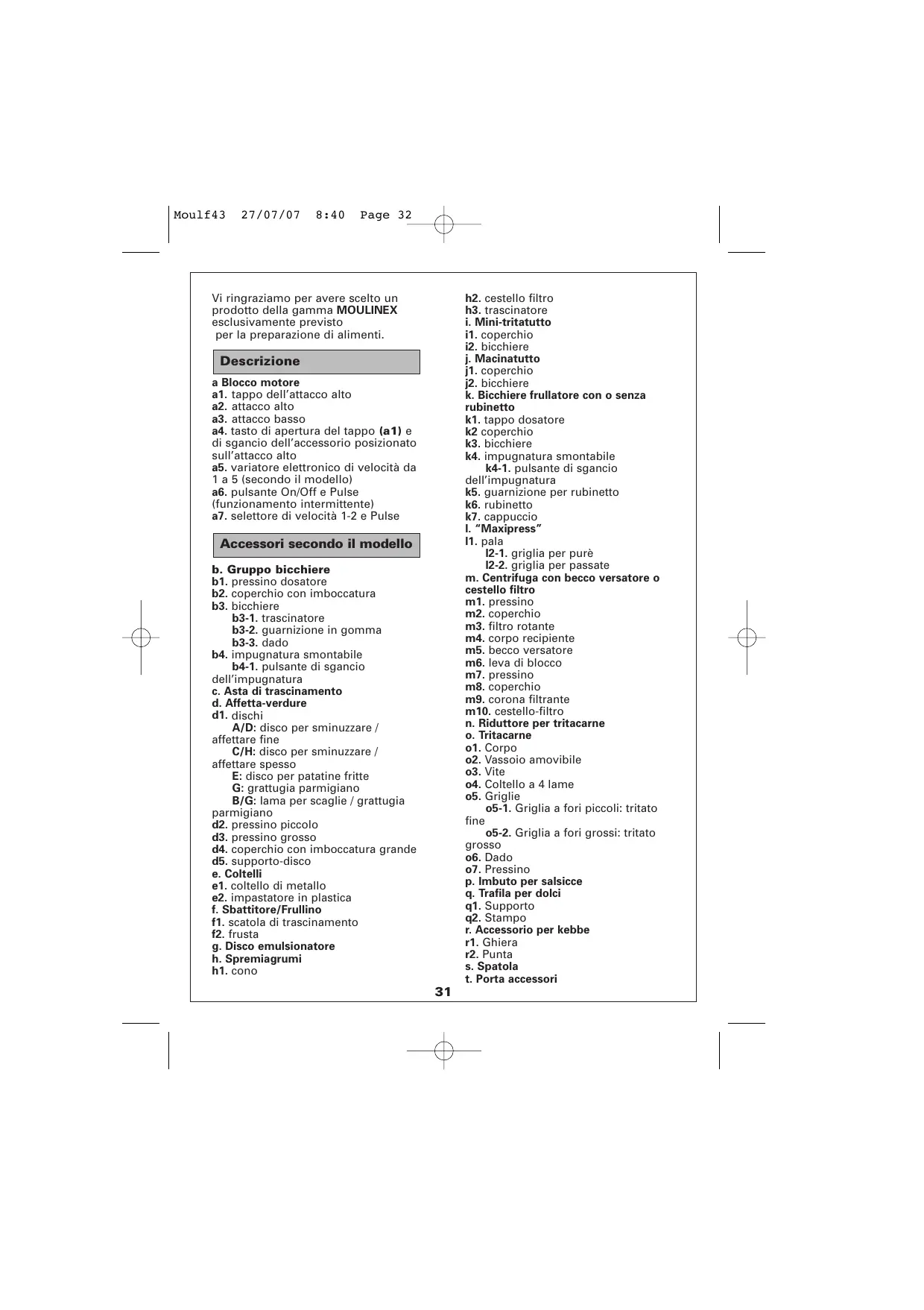 h2. cestello filtro h3. trascinatore i. Mini-tritatutto i1. coperchio i2. bicchiere j. Macinatutto j1. coperchio j2. bicchiere k. Bicchiere frullatore con o senza rubinetto k1. tappo dosatore k2 coperchio k3. bicchiere k4. impugnatura smontabile k4-1. pulsante di sgancio dell’impugnatura k5. guarnizione per rubinetto k6. rubinetto k7. cappuccio l. “Maxipress” l1. pala l2-1. griglia per purè l2-2. griglia per passate m. Centrifuga con becco versatore o cestello filtro m1. pressino m2. coperchio m3. filtro rotante m4. corpo recipiente m5. becco versatore m6. leva di blocco m7. pressino m8. coperchio m9. corona filtrante m10. cestello-filtro n. Riduttore per tritacarne o. Tritacarne o1. Corpo o2. Vassoio amovibile o3. Vite o4. Coltello a 4 lame o5. Griglie o5-1. Griglia a fori piccoli: tritato fine o5-2. Griglia a fori grossi: tritato grosso o6. Dado o7. Pressino p. Imbuto per salsicce q. Trafila per dolci q1. Supporto q2. Stampo r. Accessorio per kebbe r1. Ghiera r2. Punta s. Spatola t. Porta accessori