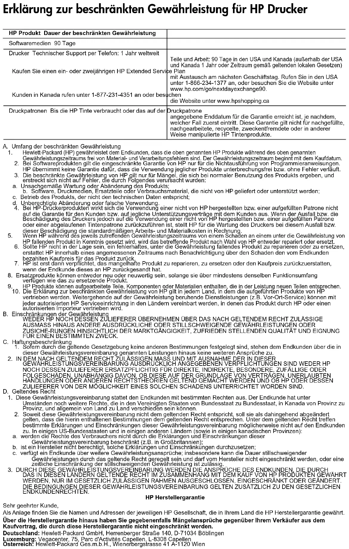 DALLA LEGGE, NON ESCLUDONO, LIMITANO O MODIFICANO, BENSÌ INTEGRANO, I DIRITTI LEGALI APPLICABILI ALLA VENDITA DEI PRODOTTI HP AI CLIENTI DI TALI PAESI. Garanzia del Produttore Gentile Cliente, In allegato troverà i nomi e indirizzi delle Società del Gruppo HP che prestano i servizi in Garanzia (garanzia di buon funzionamento e garanzia convenzionale) in Italia. Oltre alla Garanzia del Produttore, Lei potrà inoltre far valere i propri diritti nei confronti del venditore di tali prodotti, come previsto negli articoli 1519 bis e seguenti del Codice Civile. Italia: Hewlett-Packard Italiana S.p.A, Via G. Di Vittorio 9, 20063 Cernusco sul Naviglio Prodotto HP Durata della garanzia limitata Supporti del software 90 giorni Stampante Supporto tecnico telefonico: 1 anno in tutto il mondo Parti e manodopera: 90 giorni negli USA e in CANADA (al di fuori di USA e CANADA 1 anno o a termini di legge) Acquista il piano di assistenza HP Next Business Day Exchange Extended Service Plan per uno o due anni. Per gli Stati Uniti, chiama il numero 1-866-234-1377 oppure visita il sito www.hp.com/go/nextdayexchange90. Il clienti canadesi possono chiamare il numero 1-877-231-4351 o visitare il sito www.hpshopping.ca Cartucce di stampa o di inchiostro Fino ad esaurimento dell'inchiostro HP o fino al raggiungimento della data di "scadenza della garanzia" stampata sulla cartuccia, a seconda di quale evento si verifichi per primo. La presente garanzia non copre i prodotti con inchiostro HP che siano stati ricaricati, ricostruiti, ricondizionati, utilizzati in modo improprio o manomessi. Dichiarazione di garanzia limitata della stampante HPCartouche d’encre noireCartouche trichromique