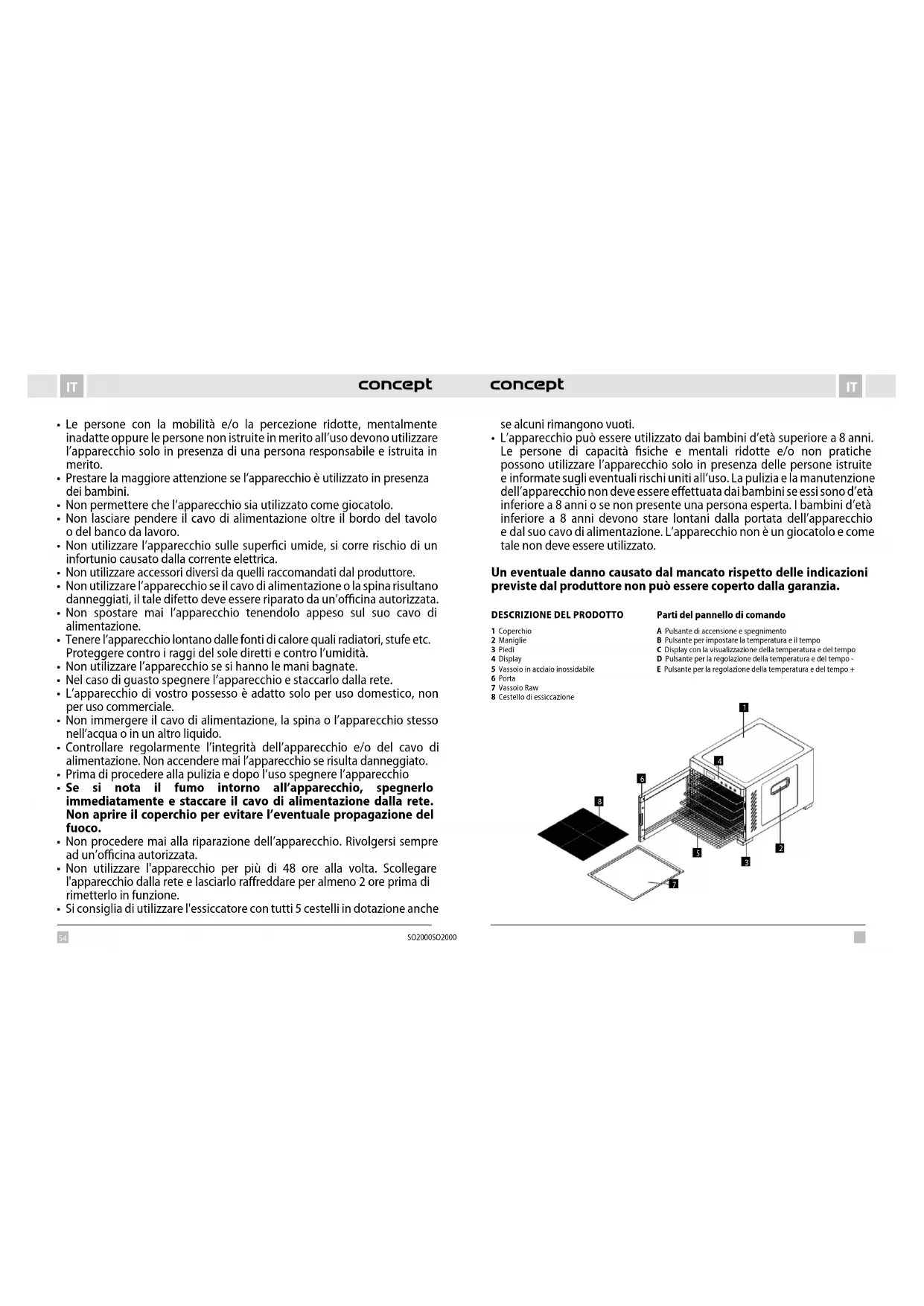 Scarica le istruzioni per il tuo Essiccatore alimentare in formato PDF gratuitamente! Trova il tuo manuale SO2000 - Concept e riprendi in mano il tuo dispositivo elettronico. In questa pagina sono pubblicati tutti i documenti necessari per l'utilizzo del tuo dispositivo. SO2000 del marchio Concept.