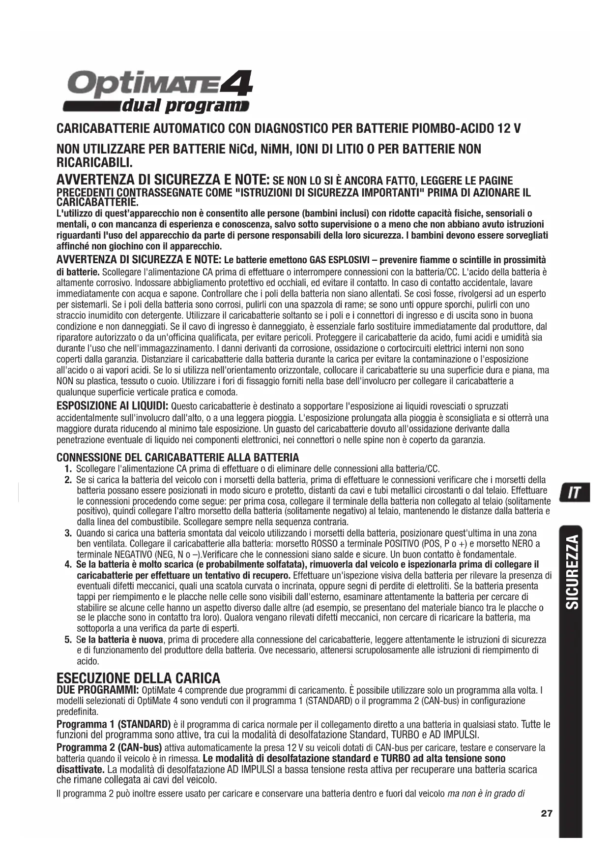 dual program CARICABATTERIE AUTOMATICO CON DIAGNOSTICO PER BATTERIE PIOMBO-ACIDO 12 VNON UTILIZZARE PER BATTERIE NiCd, NiMH, IONI DI LITIO O PER BATTERIE NON RICARICABILI. AVVERTENZA DI SICUREZZA E NOTE: SE NON LO SI È ANCORA FATTO, LEGGERE LE PAGINE PRECEDENTI CONTRASSEGNATE COME "ISTRUZIONI DI SICUREZZA IMPORTANTI" PRIMA DI AZIONARE IL CARICABATTERIE. L'utilizzo di quest’apparecchio non è consentito alle persone (bambini inclusi) con ridotte capacità fisiche, sensoriali o mentali, o con mancanza di esperienza e conoscenza, salvo sotto supervisione o a meno che non abbiano avuto istruzioni riguardanti l'uso del apparecchio da parte di persone responsabili della loro sicurezza. I bambini devono essere sorvegliati affinché non giochino con il apparecchio. AVVERTENZA DI SICUREZZA E NOTE: Le batterie emettono GAS ESPLOSIVI – prevenire fiamme o scintille in prossimità di batterie. Scollegare l'alimentazione CA prima di effettuare o interrompere connessioni con la batteria/CC. L'acido della batteria è altamente corrosivo. Indossare abbigliamento protettivo ed occhiali, ed evitare il contatto. In caso di contatto accidentale, lavare immediatamente con acqua e sapone. Controllare che i poli della batteria non siano allentati. Se così fosse, rivolgersi ad un esperto per sistemarli. Se i poli della batteria sono corrosi, pulirli con una spazzola di rame; se sono unti oppure sporchi, pulirli con uno straccio inumidito con detergente. Utilizzare il caricabatterie soltanto se i poli e i connettori di ingresso e di uscita sono in buona condizione e non danneggiati. Se il cavo di ingresso è danneggiato, è essenziale farlo sostituire immediatamente dal produttore, dal riparatore autorizzato o da un'officina qualificata, per evitare pericoli. Proteggere il caricabatterie da acido, fumi acidi e umidità sia durante l'uso che nell'immagazzinamento. I danni derivanti da corrosione, ossidazione o cortocircuiti elettrici interni non sono coperti dalla garanzia. Distanziare il caricabatterie dalla batteria durante la carica per evitare la contaminazione o l'esposizione all'acido o ai vapori acidi. Se lo si utilizza nell'orientamento orizzontale, collocare il caricabatterie su una superficie dura e piana, ma NON su plastica, tessuto o cuoio. Utilizzare i fori di fissaggio forniti nella base dell'involucro per collegare il caricabatterie a qualunque superficie verticale pratica e comoda. ESPOSIZIONE AI LIQUIDI: Questo caricabatterie è destinato a sopportare l'esposizione ai liquidi rovesciati o spruzzati accidentalmente sull'involucro dall'alto, o a una leggera pioggia. L'esposizione prolungata alla pioggia è sconsigliata e si otterrà una maggiore durata riducendo al minimo tale esposizione. Un guasto del caricabatterie dovuto all'ossidazione derivante dalla penetrazione eventuale di liquido nei componenti elettronici, nei connettori o nelle spine non è coperto da garanzia.CONNESSIONE DEL CARICABATTERIE ALLA BATTERIA