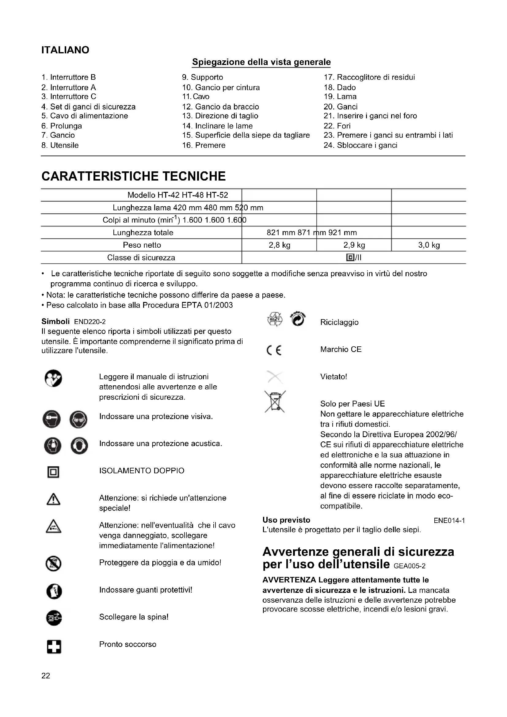 - Peso calcolato in base alla Procedura EPTA 01/2003 Simboli END220-2 Il seguente elenco riporta i simboli utilizzati per questo utensile. È importante comprenderne il significato prima di utilizzare l'utensile. Leggere il manuale di istruzioni attenendosi alle avvertenze e alle prescrizioni di sicurezza. Indossare una protezione visiva. Indossare una protezione acustica. ISOLAMENTO DOPPIO Attenzione: si richiede un'attenzione speciale! Attenzione: nell'eventualità che il cavo venga danneggiato, scollegare immediatamente l'alimentazione! Proteggere da pioggia e da umido! Indossare guanti protettivi! Scollegare la spina! Pronto soccorso Riciclaggio Marchio CE Vietato! Solo per Paesi UE Non gettare le apparecchiature elettriche tra i rifiuti domestici. Secondo la Direttiva Europea 2002/96/ CE sui rifiuti di apparecchiature elettriche ed elettroniche e la sua attuazione in conformità alle norme nazionali, le apparecchiature elettriche esauste devono essere raccolte separatamente, al fine di essere riciclate in modo eco- compatibile. Uso previsto ENE014-1 L'utensile è progettato per il taglio delle siepi. Avvertenze generali di sicurezza per l’uso dell’utensile GEA005-2 AVVERTENZA Leggere attentamente tutte le avvertenze di sicurezza e le istruzioni. La mancata osservanza delle istruzioni e delle avvertenze potrebbe provocare scosse elettriche, incendi e/o lesioni gravi.