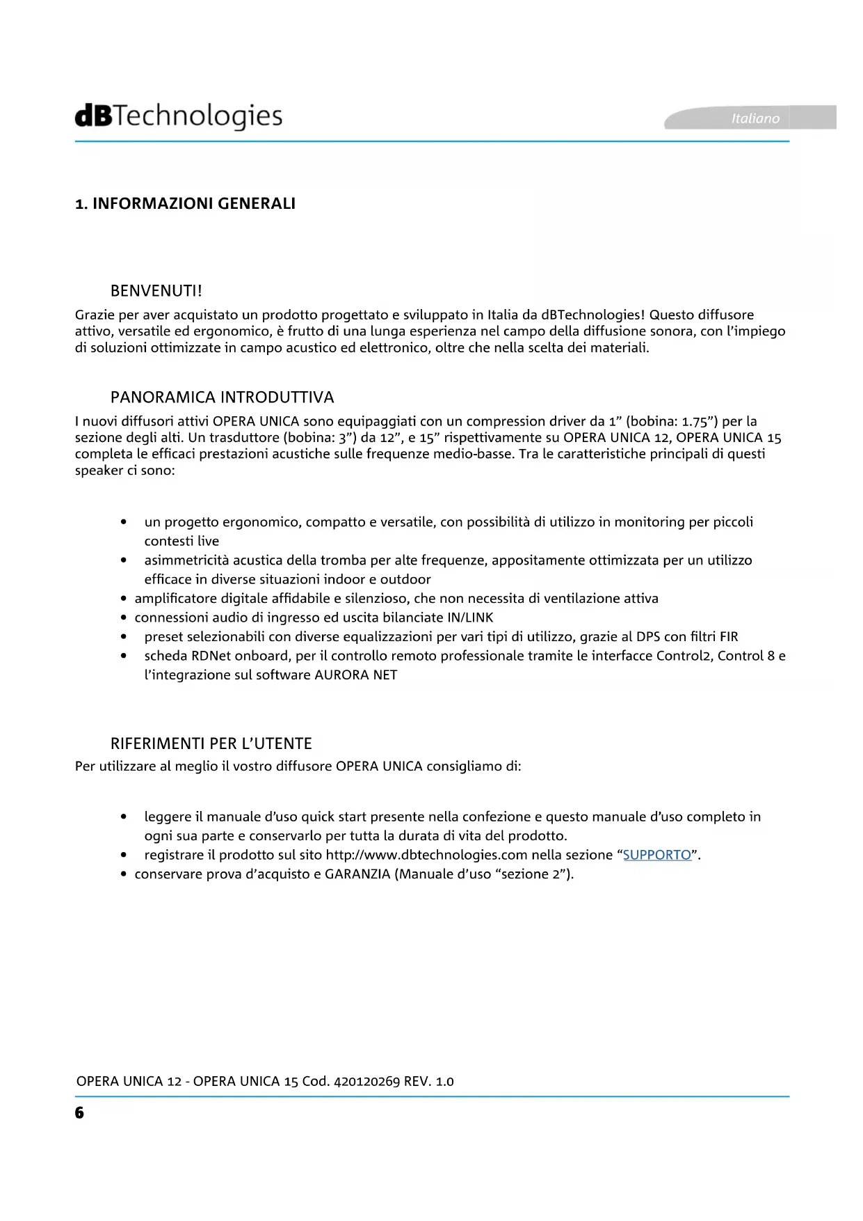 Grazie per aver acquistato un prodotto progettato e sviluppato in Italia da dBTechnologies! Questo diffusore attivo, versatile ed ergonomico, è frutto di una lunga esperienza nel campo della diffusione sonora, con l’impiego di soluzioni ottimizzate in campo acustico ed elettronico, oltre che nella scelta dei materiali. I nuovi diffusori attivi OPERA UNICA sono equipaggiati con un compression driver da 1” (bobina: 1.75”) per la sezione degli alti. Un trasduttore (bobina: 3”) da 12”, e 15” rispettivamente su OPERA UNICA 12, OPERA UNICA 15 completa le efcaci prestazioni acustiche sulle frequenze medio-basse. Tra le caratteristiche principali di questi speaker ci sono: Per utilizzare al meglio il vostro diffusore OPERA UNICA consigliamo di:
