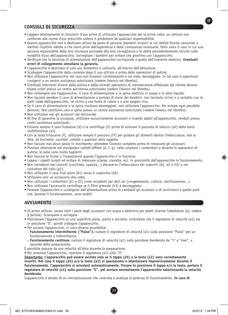 • Votre appareil est destiné uniquement à un usage domestique et culinaire et à l’intérieur de la maison. • Débranchez toujours l’appareil dès que vous cessez de l’utiliser et lorsque vous le nettoyez. • N’utilisez pas votre appareil s’il ne fonctionne pas correctement ou s’il a été endommagé. Dans ce cas, adressez-vous à un centre agréé (voir liste dans le livret service). • Toute intervention autre que le nettoyage et l’entretien usuel par le client doit être effectuée par un centre agréé (voir liste dans le livret service). • Ne mettez pas l’appareil, le câble d’alimentation ou la fiche dans l’eau ou tout autre liquide. • Ne laissez pas le câble d’alimentation pendre à portée de mains des enfants, être à proximité ou en contact avec les parties chaudes de l’appareil, près d’une source de chaleur ou sur un angle vif. • Si le câble d’alimentation ou la fiche sont endommagés, n’utilisez pas l’appareil. Afin d’éviter tout danger faites-les obligatoirement remplacer par un centre agréé (voir liste dans le livret service). • Ne passez pas les accessoires au micro-ondes. • Pour votre sécurité, n’utilisez que des accessoires et des pièces détachées adaptés à votre appareil, vendus en centre agréé. • Retirez toujours le bol mixeur (d) ou la centrifugeuse (h) avant d’actionner le bouton de déverrouillage (a2) de la tête multifonctions (a3). • Avec l’accessoire tête hachoir (f), utilisez toujours le poussoir (f7) pour guider les aliments dans la cheminée, jamais les doigts, ni fourchette, ni cuillère, ni couteau ou tout autre objet. • Ne touchez jamais les pièces en mouvement et attendez l’arrêt complet de l’appareil avant d’enlever les accessoires.
