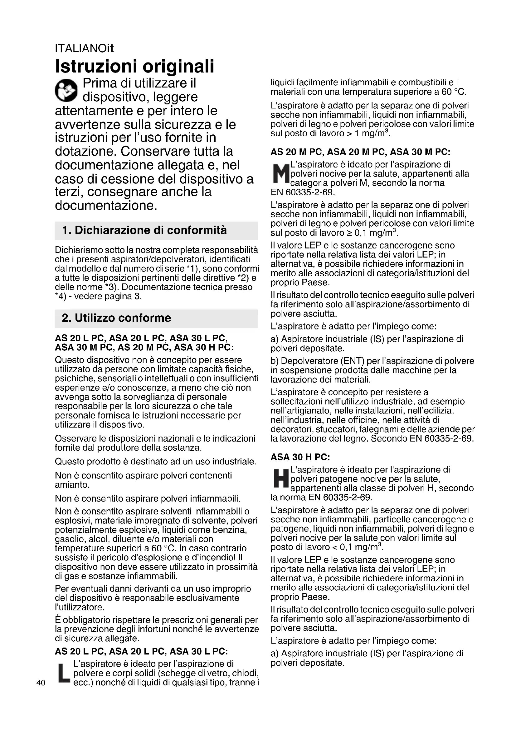 Istruzioni originali Prima di utilizzare il dispositivo, leggere attentamente e per intero le avvertenze sulla sicurezza e le istruzioni per l’uso fornite in dotazione. Conservare tutta la documentazione allegata e, nel caso di cessione del dispositivo a terzi, consegnare anche la documentazione. Dichiariamo sotto la nostra completa responsabilità che i presenti aspiratori/depolveratori, identificati dal modello e dal numero di serie *1), sono conformi a tutte le disposizioni pertinenti delle direttive *2) e delle norme *3). Documentazione tecnica presso *4) - vedere pagina 3. AS 20 L PC, ASA 20 L PC, ASA 30 L PC, ASA 30 M PC, AS 20 M PC, ASA 30 H PC: Questo dispositivo non è concepito per essere utilizzato da persone con limitate capacità fisiche, psichiche, sensoriali o intellettuali o con insufficienti esperienze e/o conoscenze, a meno che ciò non avvenga sotto la sorveglianza di personale responsabile per la loro sicurezza o che tale personale fornisca le istruzioni necessarie per utilizzare il dispositivo. Osservare le disposizioni nazionali e le indicazioni fornite dal produttore della sostanza. Questo prodotto è destinato ad un uso industriale. Non è consentito aspirare polveri contenenti amianto. Non è consentito aspirare polveri infiammabili. Non è consentito aspirare solventi infiammabili o esplosivi, materiale impregnato di solvente, polveri potenzialmente esplosive, liquidi come benzina, gasolio, alcol, diluente e/o materiali con temperature superiori a 60 °C. In caso contrario sussiste il pericolo d’esplosione e d’incendio! Il dispositivo non deve essere utilizzato in prossimità di gas e sostanze infiammabili. Per eventuali danni derivanti da un uso improprio del dispositivo è responsabile esclusivamente l’utilizzatore. È obbligatorio rispettare le prescrizioni generali per la prevenzione degli infortuni nonché le avvertenze di sicurezza allegate. AS 20 L PC, ASA 20 L PC, ASA 30 L PC: L’aspiratore è ideato per l’aspirazione di polvere e corpi solidi (schegge di vetro, chiodi, ecc.) nonché di liquidi di qualsiasi tipo, tranne i liquidi facilmente infiammabili e combustibili e i materiali con una temperatura superiore a 60 °C. L'aspiratore è adatto per la separazione di polveri secche non infiammabili, liquidi non infiammabili, polveri di legno e polveri pericolose con valori limite sul posto di lavoro > 1 mg/m³. AS 20 M PC, ASA 20 M PC, ASA 30 M PC: L’aspiratore è ideato per l’aspirazione di polveri nocive per la salute, appartenenti alla categoria polveri M, secondo la norma EN 60335-2-69. L'aspiratore è adatto per la separazione di polveri secche non infiammabili, liquidi non infiammabili, polveri di legno e polveri pericolose con valori limite sul posto di lavoro ≥ 0,1 mg/m³. Il valore LEP e le sostanze cancerogene sono riportate nella relativa lista dei valori LEP; in alternativa, è possibile richiedere informazioni in merito alle associazioni di categoria/istituzioni del proprio Paese. Il risultato del controllo tecnico eseguito sulle polveri fa riferimento solo all’aspirazione/assorbimento di polvere asciutta. L’aspiratore è adatto per l’impiego come: a) Aspiratore industriale (IS) per l’aspirazione di polveri depositate. b) Depolveratore (ENT) per l’aspirazione di polvere in sospensione prodotta dalle macchine per la lavorazione dei materiali. L’aspiratore è concepito per resistere a sollecitazioni nell’utilizzo industriale, ad esempio nell’artigianato, nelle installazioni, nell’edilizia, nell’industria, nelle officine, nelle attività di decoratori, stuccatori, falegnami e delle aziende per la lavorazione del legno. Secondo EN 60335-2-69. ASA 30 H PC: L'aspiratore è ideato per l'aspirazione di polveri patogene nocive per la salute, appartenenti alla classe di polveri H, secondo la norma EN 60335-2-69. L'aspiratore è adatto per la separazione di polveri secche non infiammabili, particelle cancerogene e patogene, liquidi non infiammabili, polveri di legno e polveri nocive per la salute con valori limite sul posto di lavoro < 0,1 mg/m³. Il valore LEP e le sostanze cancerogene sono riportate nella relativa lista dei valori LEP; in alternativa, è possibile richiedere informazioni in merito alle associazioni di categoria/istituzioni del proprio Paese. Il risultato del controllo tecnico eseguito sulle polveri fa riferimento solo all’aspirazione/assorbimento di polvere asciutta. L’aspiratore è adatto per l’impiego come: a) Aspiratore industriale (IS) per l’aspirazione di polveri depositate.
