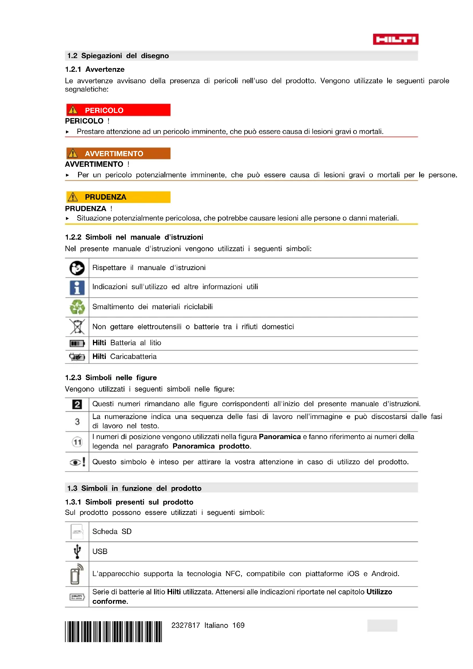Sul prodotto possono essere utilizzati i seguenti simboli: Scheda SD USB L'apparecchio supporta la tecnologia NFC, compatibile con piattaforme iOS e Android. Serie di batterie al litio Hilti utilizzata. Attenersi alle indicazioni riportate nel capitolo Utilizzo conforme.170 Italiano 2327817 *2327817* Batteria al litio Attenzione: rischio di ingerimento di piccole parti (pila a bottone) Se indicato sul prodotto, il prodotto è stato certificato da questo ente di certificazione per il mercato statunitense/americano e canadese secondo le normative valide.