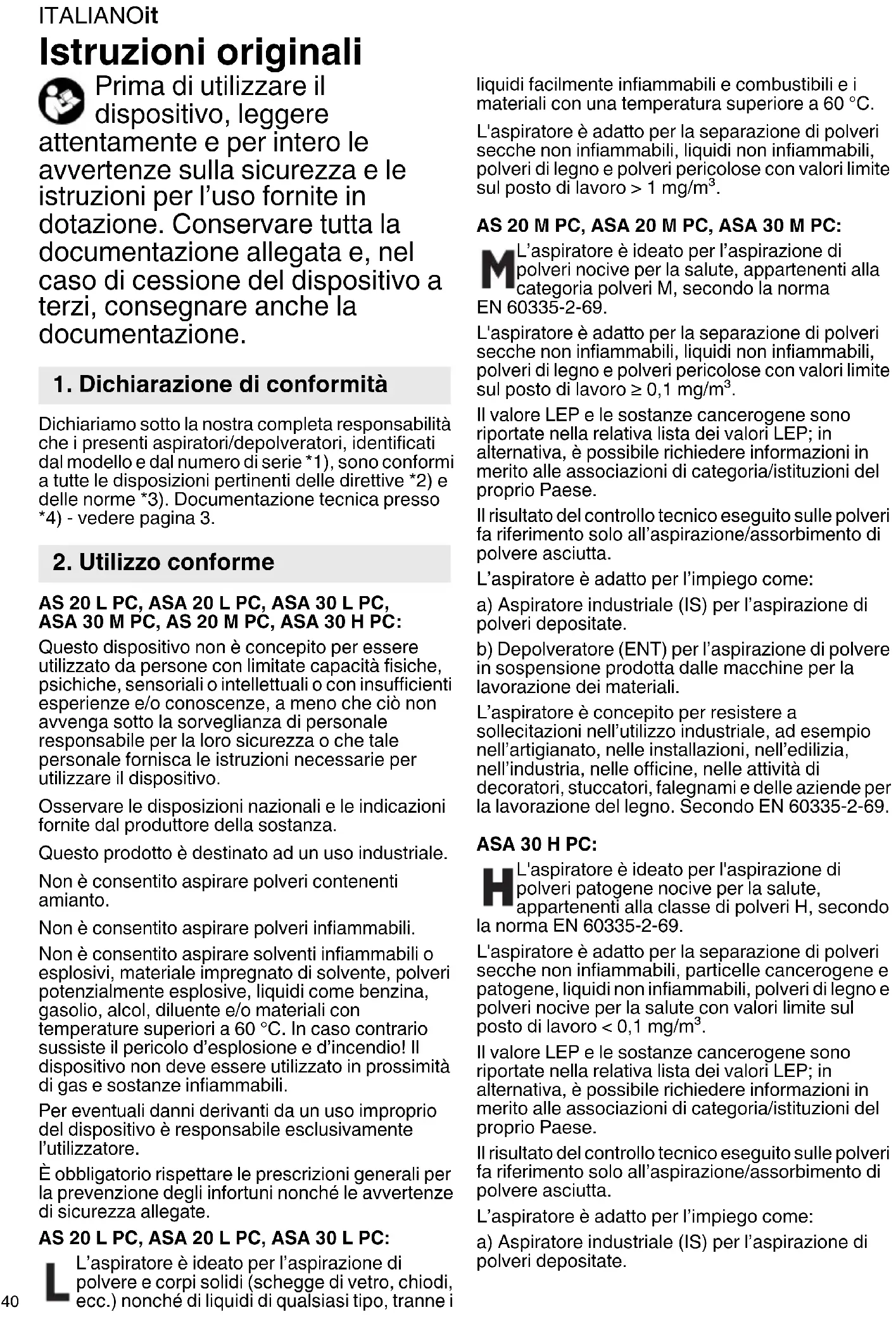 Istruzioni originali Prima di utilizzare il dispositivo, leggere attentamente e per intero le avvertenze sulla sicurezza e le istruzioni per l’uso fornite in dotazione. Conservare tutta la documentazione allegata e, nel caso di cessione del dispositivo a terzi, consegnare anche la documentazione. Dichiariamo sotto la nostra completa responsabilità che i presenti aspiratori/depolveratori, identificati dal modello e dal numero di serie *1), sono conformi a tutte le disposizioni pertinenti delle direttive *2) e delle norme *3). Documentazione tecnica presso *4) - vedere pagina 3. AS 20 L PC, ASA 20 L PC, ASA 30 L PC, ASA 30 M PC, AS 20 M PC, ASA 30 H PC: Questo dispositivo non è concepito per essere utilizzato da persone con limitate capacità fisiche, psichiche, sensoriali o intellettuali o con insufficienti esperienze e/o conoscenze, a meno che ciò non avvenga sotto la sorveglianza di personale responsabile per la loro sicurezza o che tale personale fornisca le istruzioni necessarie per utilizzare il dispositivo. Osservare le disposizioni nazionali e le indicazioni fornite dal produttore della sostanza. Questo prodotto è destinato ad un uso industriale. Non è consentito aspirare polveri contenenti amianto. Non è consentito aspirare polveri infiammabili. Non è consentito aspirare solventi infiammabili o esplosivi, materiale impregnato di solvente, polveri potenzialmente esplosive, liquidi come benzina, gasolio, alcol, diluente e/o materiali con temperature superiori a 60 °C. In caso contrario sussiste il pericolo d’esplosione e d’incendio! Il dispositivo non deve essere utilizzato in prossimità di gas e sostanze infiammabili. Per eventuali danni derivanti da un uso improprio del dispositivo è responsabile esclusivamente l’utilizzatore. È obbligatorio rispettare le prescrizioni generali per la prevenzione degli infortuni nonché le avvertenze di sicurezza allegate. AS 20 L PC, ASA 20 L PC, ASA 30 L PC: L’aspiratore è ideato per l’aspirazione di polvere e corpi solidi (schegge di vetro, chiodi, ecc.) nonché di liquidi di qualsiasi tipo, tranne i liquidi facilmente infiammabili e combustibili e i materiali con una temperatura superiore a 60 °C. L'aspiratore è adatto per la separazione di polveri secche non infiammabili, liquidi non infiammabili, polveri di legno e polveri pericolose con valori limite sul posto di lavoro > 1 mg/m³. AS 20 M PC, ASA 20 M PC, ASA 30 M PC: L’aspiratore è ideato per l’aspirazione di polveri nocive per la salute, appartenenti alla categoria polveri M, secondo la norma EN 60335-2-69. L'aspiratore è adatto per la separazione di polveri secche non infiammabili, liquidi non infiammabili, polveri di legno e polveri pericolose con valori limite sul posto di lavoro ≥ 0,1 mg/m³. Il valore LEP e le sostanze cancerogene sono riportate nella relativa lista dei valori LEP; in alternativa, è possibile richiedere informazioni in merito alle associazioni di categoria/istituzioni del proprio Paese. Il risultato del controllo tecnico eseguito sulle polveri fa riferimento solo all’aspirazione/assorbimento di polvere asciutta. L’aspiratore è adatto per l’impiego come: a) Aspiratore industriale (IS) per l’aspirazione di polveri depositate. b) Depolveratore (ENT) per l’aspirazione di polvere in sospensione prodotta dalle macchine per la lavorazione dei materiali. L’aspiratore è concepito per resistere a sollecitazioni nell’utilizzo industriale, ad esempio nell’artigianato, nelle installazioni, nell’edilizia, nell’industria, nelle officine, nelle attività di decoratori, stuccatori, falegnami e delle aziende per la lavorazione del legno. Secondo EN 60335-2-69. ASA 30 H PC: L'aspiratore è ideato per l'aspirazione di polveri patogene nocive per la salute, appartenenti alla classe di polveri H, secondo la norma EN 60335-2-69. L'aspiratore è adatto per la separazione di polveri secche non infiammabili, particelle cancerogene e patogene, liquidi non infiammabili, polveri di legno e polveri nocive per la salute con valori limite sul posto di lavoro < 0,1 mg/m³. Il valore LEP e le sostanze cancerogene sono riportate nella relativa lista dei valori LEP; in alternativa, è possibile richiedere informazioni in merito alle associazioni di categoria/istituzioni del proprio Paese. Il risultato del controllo tecnico eseguito sulle polveri fa riferimento solo all’aspirazione/assorbimento di polvere asciutta. L’aspiratore è adatto per l’impiego come: a) Aspiratore industriale (IS) per l’aspirazione di polveri depositate.