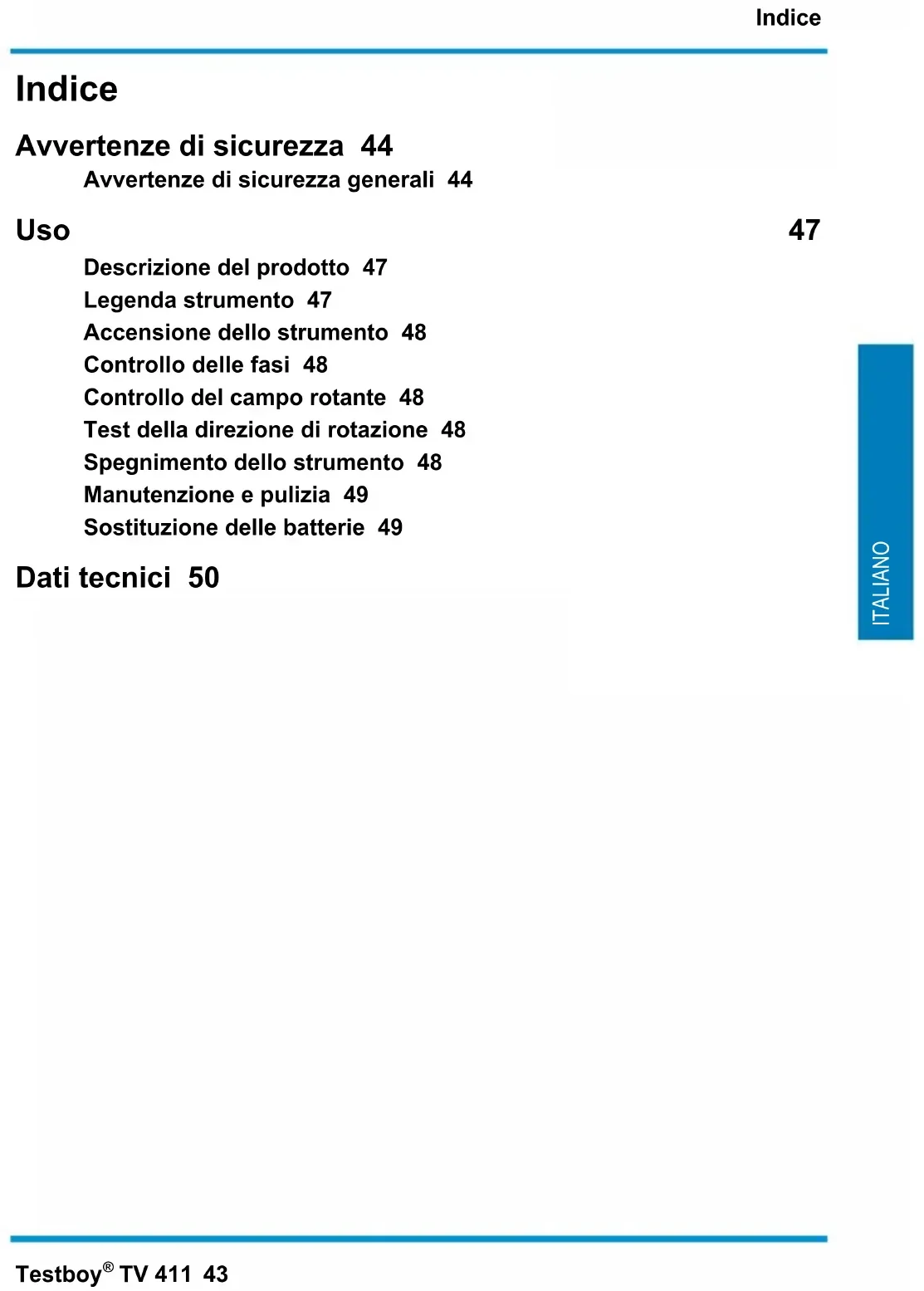 TV 411 43 ITALIANO Indice Avvertenze di sicurezza 44 Avvertenze di sicurezza generali 44 Uso 47 Descrizione del prodotto 47 Legenda strumento 47 Accensione dello strumento 48 Controllo delle fasi 48 Controllo del campo rotante 48 Test della direzione di rotazione 48 Spegnimento dello strumento 48 Manutenzione e pulizia 49 Sostituzione delle batterie 49 Dati tecnici 50Avvertenze di sicurezza 44 Testboy