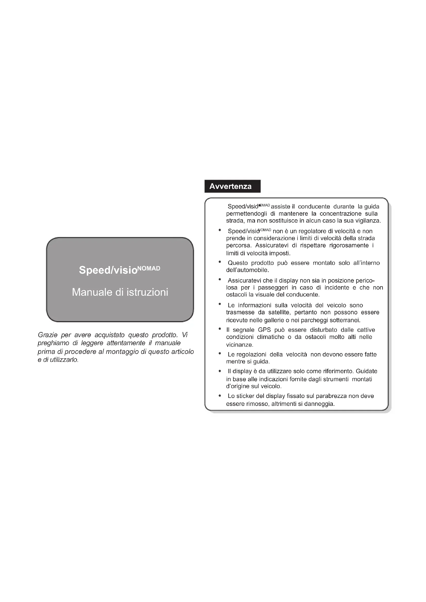 essere rimosso, altrimenti si danneggia.34 Caratteristiche Speed/visio• NOMAD è un sistema che visualizza dati sulla velocità direttamente sul parabrezza: - consente al conducente di tenere sott’occhio la velocità in tutta sicurezza, pur continuando a guardare la strada. - avvisa il conducente in caso di superamento della velocità impostata. Questo sistema include un’antenna