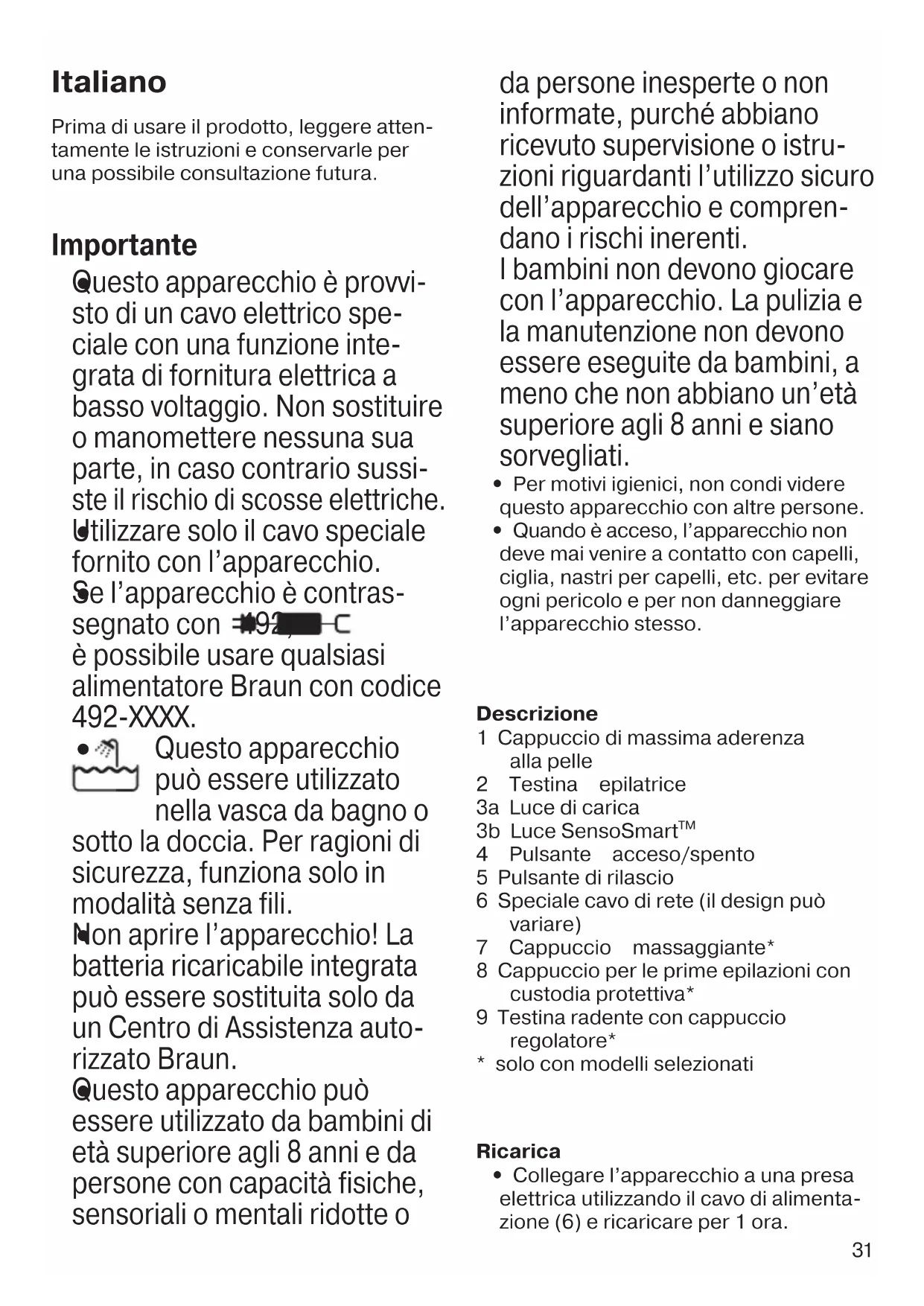 Non aprire l’apparecchio! La batteria ricaricabile integrata può essere sostituita solo da un Centro di Assistenza auto- rizzato Braun.