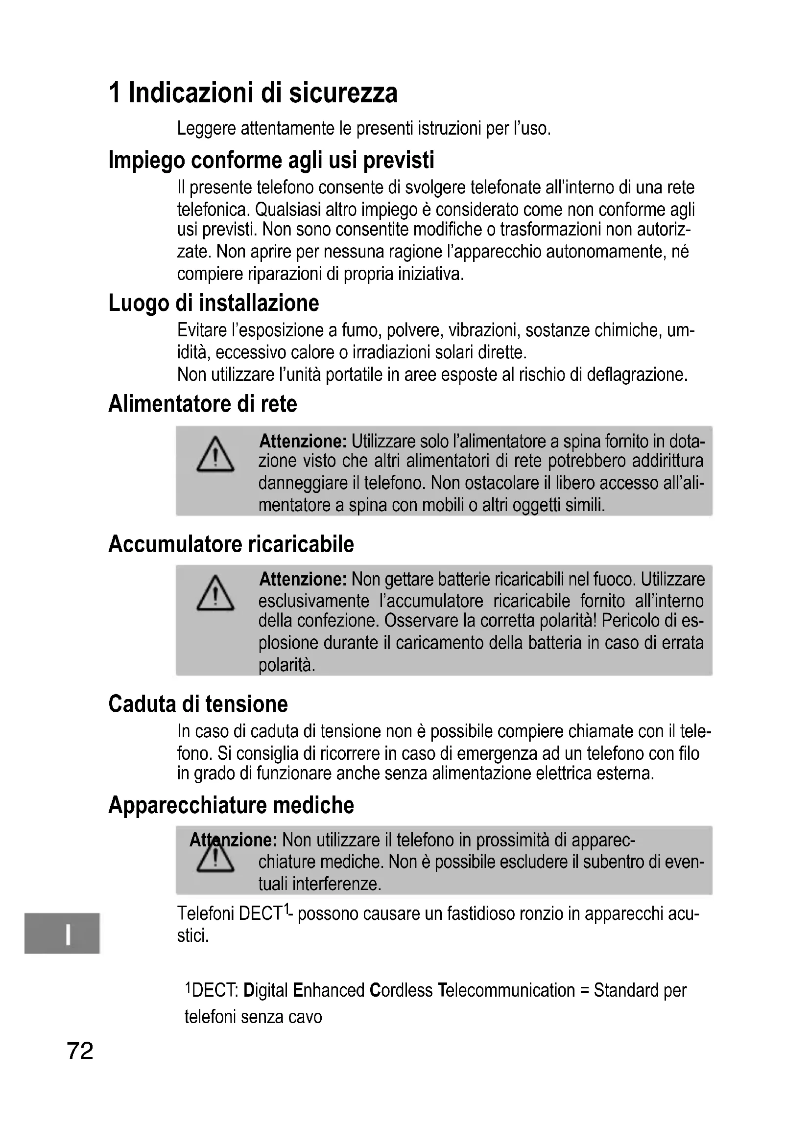 - Garanzia 104 1 Indicazioni di sicurezza Leggere attentamente le presenti istruzioni per l´uso. Impiego conforme agli usi previsti Il presente telefono consente di svolgere telefonate all´interno di una rete telefonica. Qualsiasi altro impiego è considerato come non conforme agli usi previsti. Non sono consentite modifiche o trasformazioni non autoriz- zate. Non aprire per nessuna ragione l´apparecchio autonomamente, né compiere riparazioni di propria iniziativa. Luogo di installazione Evitare l´esposizione a fumo, polvere, vibrazioni, sostanze chimiche, um- idità, eccessivo calore o irradiazioni solari dirette. Non utilizzare l´unità portatile in aree esposte al rischio di deflagrazione. Alimentatore di rete Attenzione: Utilizzare solo l´alimentatore a spina fornito in dota- zione visto che altri alimentatori di rete potrebbero addirittura danneggiare il telefono. Non ostacolare il libero accesso all´ali- mentatore a spina con mobili o altri oggetti simili. Accumulatore ricaricabile Attenzione: Non gettare batterie ricaricabili nel fuoco. Utilizzare esclusivamente l´accumulatore ricaricabile fornito all´interno della confezione. Osservare la corretta polarità! Pericolo di es- plosione durante il caricamento della batteria in caso di errata polarità. Caduta di tensione In caso di caduta di tensione non è possibile compiere chiamate con il tele- fono. Si consiglia di ricorrere in caso di emergenza ad un telefono con filo in grado di funzionare anche senza alimentazione elettrica esterna. Apparecchiature mediche Attenzione: Non utilizzare il telefono in prossimità di apparec- chiature mediche. Non è possibile escludere il subentro di even- tuali interferenze. Telefoni DECT p. 72