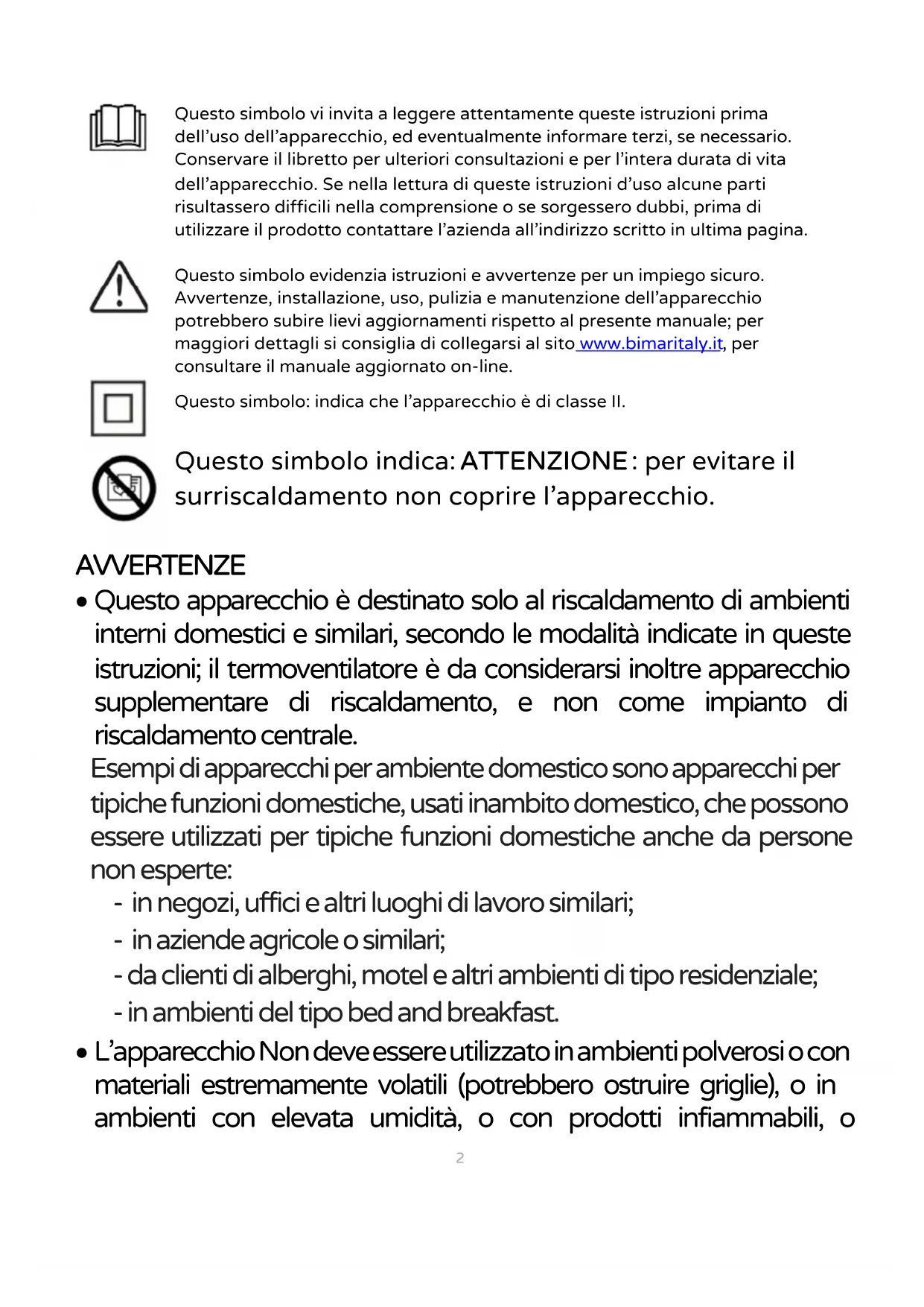 Questo simbolo vi invita a leggere attentamente queste istruzioni prima dell’uso dell’apparecchio, ed eventualmente informare terzi, se necessario. Conservare il libretto per ulteriori consultazioni e per l’intera durata di vita dell’apparecchio. Se nella lettura di queste istruzioni d’uso alcune parti risultassero difficili nella comprensione o se sorgessero dubbi, prima di utilizzare il prodotto contattare l’azienda all’indirizzo scritto in ultima pagina. Questo simbolo evidenzia istruzioni e avvertenze per un impiego sicuro. Avvertenze, installazione, uso, pulizia e manutenzione dell’apparecchio potrebbero subire lievi aggiornamenti rispetto al presente manuale; per maggiori dettagli si consiglia di collegarsi al sito www.bimaritaly.it, per consultare il manuale aggiornato on-line. Questo simbolo: indica che l’apparecchio è di classe II. Questo simbolo indica: ATTENZIONE : per evitare il surriscaldamento non coprire l’apparecchio.3 all’esterno (all’aperto). Ogni altro uso è da considerarsi improprio e pericoloso.