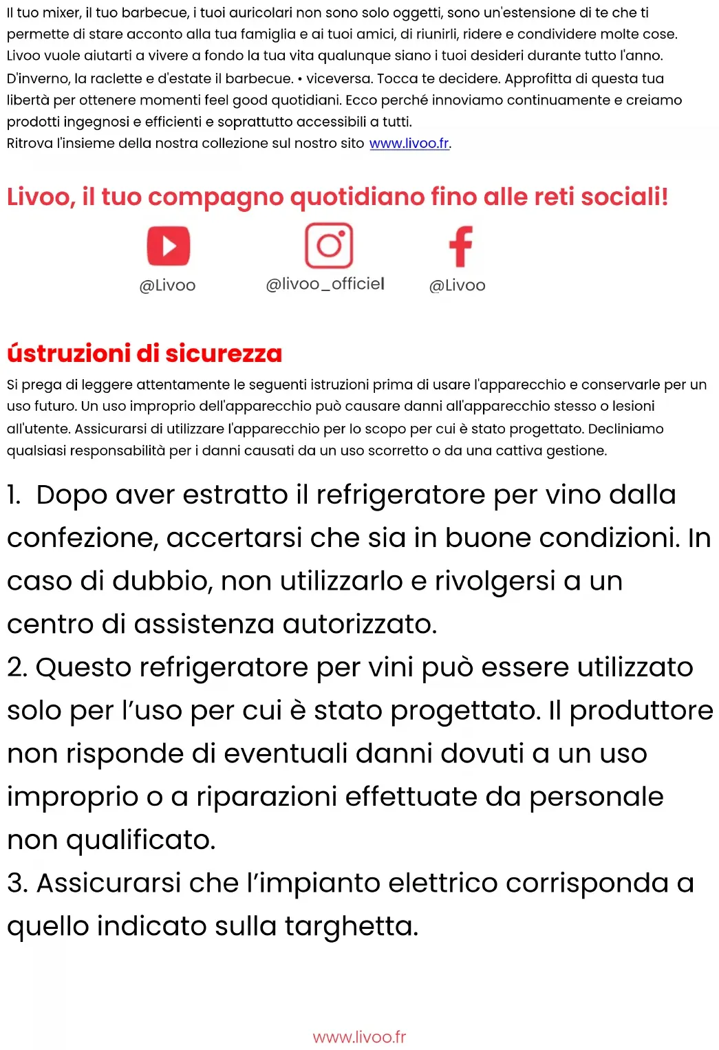 ITwww.livoo.fr Il tuo mixer, il tuo barbecue, i tuoi auricolari non sono solo oggetti, sono un'estensione di te che ti permette di stare acconto alla tua famiglia e ai tuoi amici, di riunirli, ridere e condividere molte cose. Livoo vuole aiutarti a vivere a fondo la tua vita qualunque siano i tuoi desideri durante tutto l'anno. D'inverno, la raclette e d'estate il barbecue. O viceversa. Tocca te decidere. Approfitta di questa tua libertà per ottenere momenti feel good quotidiani. Ecco perché innoviamo continuamente e creiamo prodotti ingegnosi e efficienti e soprattutto accessibili a tutti. Ritrova l'insieme della nostra collezione sul nostro sito www.livoo.fr. Livoo, il tuo compagno quotidiano fino alle reti sociali!