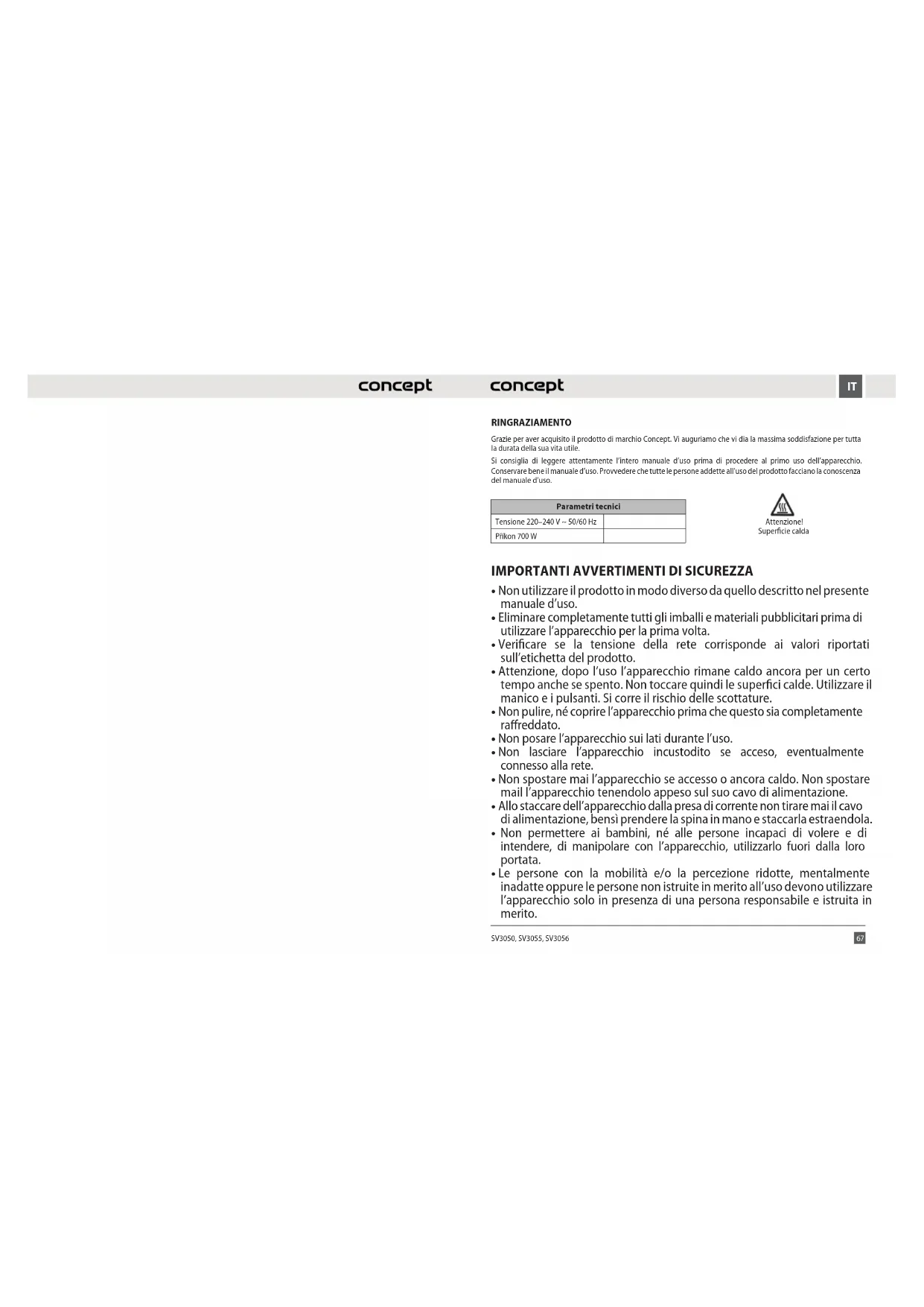 RINGRAZIAMENTO Grazie per aver acquisito il prodotto di marchio Concept. Vi auguriamo che vi dia la massima soddisfazione per tutta la durata della sua vita utile. Si consiglia di leggere attentamente l’intero manuale d’uso prima di procedere al primo uso dell’apparecchio. Conservare bene il manuale d’uso. Provvedere che tutte le persone addette all’uso del prodotto facciano la conoscenza del manuale d’uso. Parametri tecnici Tensione 220–240 V ~ 50/60 Hz Příkon 700 W