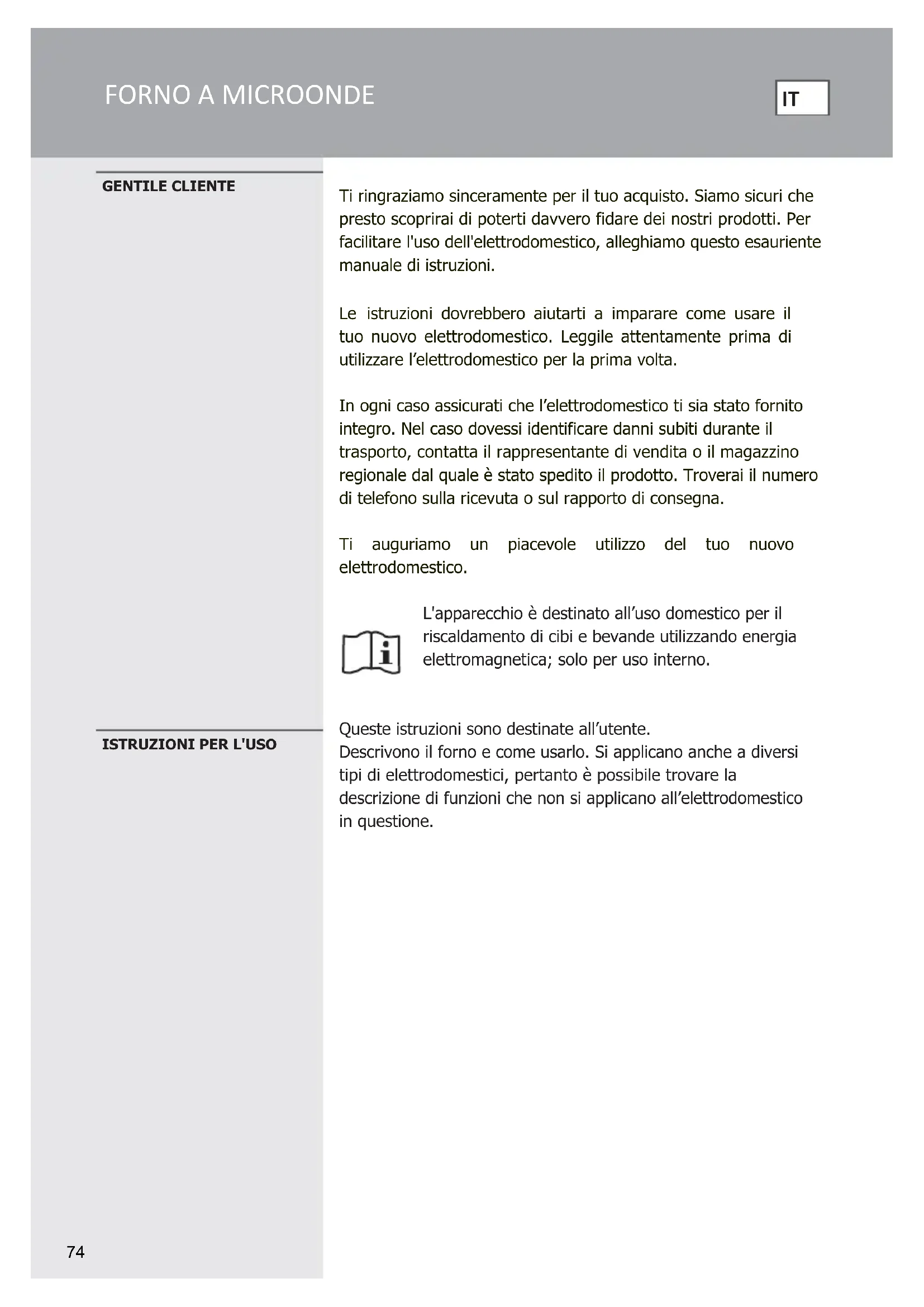 GENTILE CLIENTE Ti ringraziamo sinceramente per il tuo acquisto. Siamo sicuri che presto scoprirai di poterti davvero fidare dei nostri prodotti. Per facilitare l'uso dell'elettrodomestico, alleghiamo questo esauriente manuale di istruzioni. Le istruzioni dovrebbero aiutarti a imparare come usare il tuo nuovo elettrodomestico. Leggile attentamente prima di utilizzare l’elettrodomestico per la prima volta. In ogni caso assicurati che l’elettrodomestico ti sia stato fornito integro. Nel caso dovessi identificare danni subiti durante il trasporto, contatta il rappresentante di vendita o il magazzino regionale dal quale è stato spedito il prodotto. Troverai il numero di telefono sulla ricevuta o sul rapporto di consegna. Ti auguriamo un piacevole utilizzo del tuo nuovo elettrodomestico. L'apparecchio è destinato all’uso domestico per il riscaldamento di cibi e bevande utilizzando energia elettromagnetica; solo per uso interno.