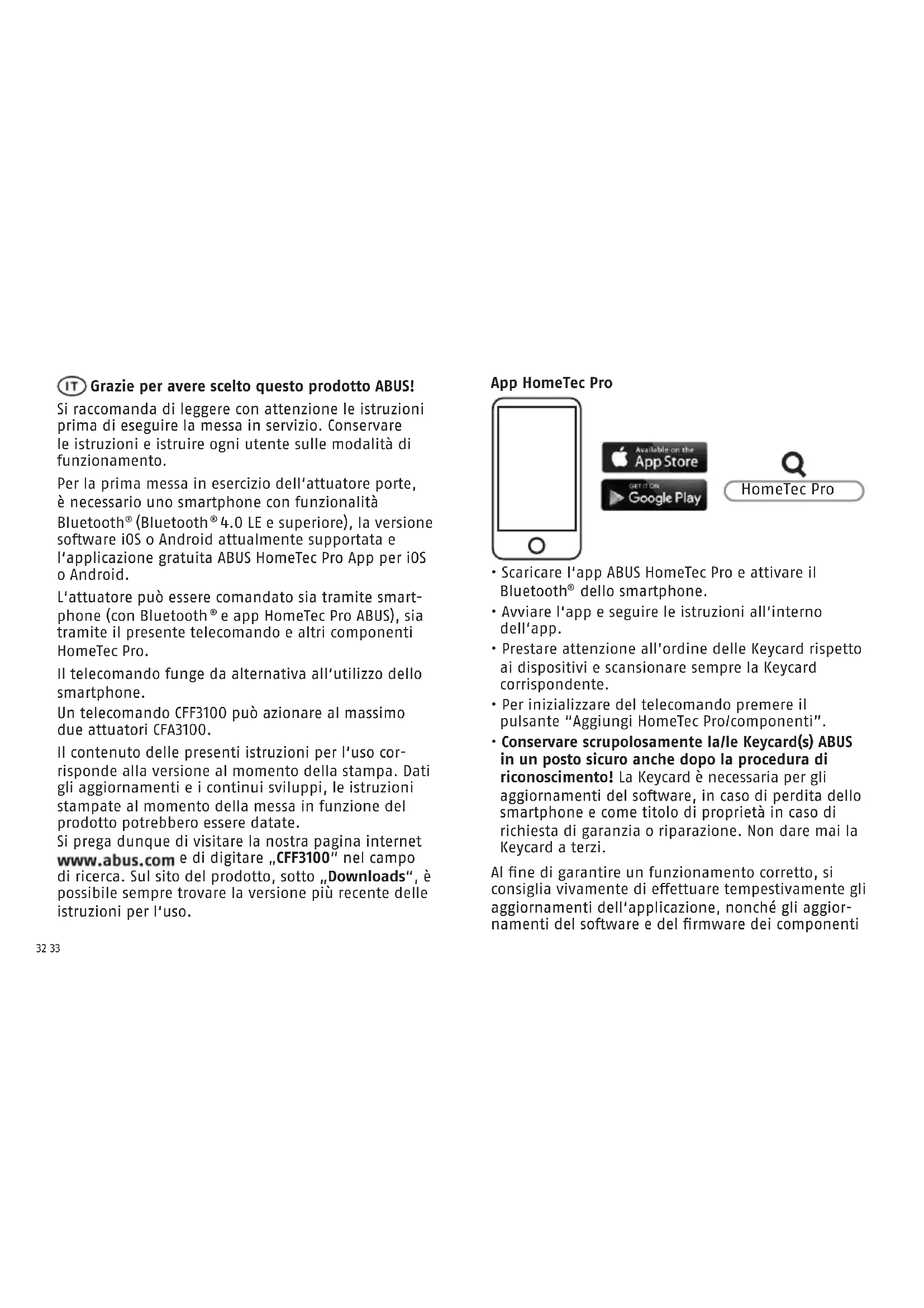 y aplicación ABUS HomeTec Pro) y también con este control remoto y otros compo- nentes HomeTec Pro. El control remoto es una alternativa al manejo a tra- vés del smartphone. Un control remoto CFF3100 puede manejar un máximo de dos accionamientos CFA3100. El contenido de este manual de instrucciones y mon- taje está actualizado en el momento de la impresión. Debido a las actualizaciones y el constante desarrollo, es posible que el manual impreso se encuentre des- actualizado en el momento de la puesta en servicio del producto. Por tanto, visite nuestra página web e introduzca „CFF3100“ en el buscador. En la lista de productos, dentro de la pestaña „Descargas“, encontrará la versión más actualizada y completa del manual de instrucciones y montaje. difetto di materiale o di fabbricazione il prodotto verrà riparato o sostituito a discrezione del garante. La garanzia di qualità termina in questi casi alla scadenza del periodo originario di garanzia. Si escludono espressamente ulteriori pretese. ABUS non è responsabile per difetti o danni causati da fattori esterni (ad esempio trasporto, uso forzato), da un utilizzo non appropriato, dal normale logoramento o dalla mancata osservanza delle presenti istruzioni. Qualora si faccia valere una pretesa di garanzia, allegare al prodotto d‘acquisto originale contente la data d‘acquisto, e una breve descrizione scritta del difetto. Testi di licenza Il marchio e i loghi Bluetooth® sono marchi registrati di Bluetooth SIG, Inc. e sono utilizzati da ABUS August Bremicker Söhne KG su licenza. Altri marchi e nomi commerciali appartengono ai rispettivi proprietari. Apple e il logo Apple sono marchi di Apple Inc. regis- trati negli Stati Uniti e in altri paesi e territori. App Store è un marchio di servizio di Apple Inc. Google Play e il logo Google Play sono marchi di Google LLC. Ci si riservano modiche tecniche. Per errori e refusi di stampa non ci si assume alcuna responsabilità.40 41