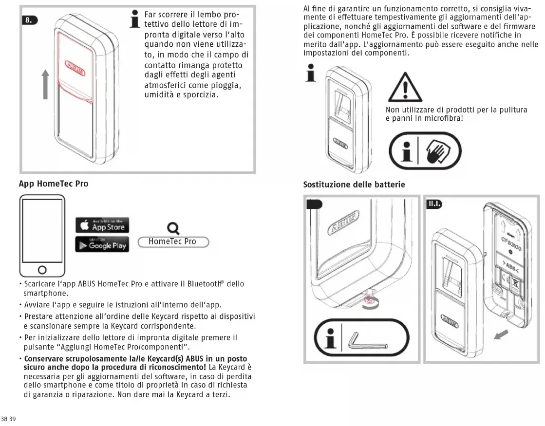 - Conservare scrupolosamente la/le Keycard(s) ABUS in un posto sicuro anche dopo la procedura di riconoscimento! La Keycard è necessaria per gli aggiornamenti del soware, in caso di perdita dello smartphone e come titolo di proprietà in caso di richiesta di garanzia o riparazione. Non dare mai la Keycard a terzi. HomeTec Pro Al ne di garantire un funzionamento corretto, si consiglia viva- mente di eettuare tempestivamente gli aggiornamenti dell‘ap- plicazione, nonché gli aggiornamenti del soware e del rmware dei componenti HomeTec Pro. È possibile ricevere notiche in merito dall’app. L‘aggiornamento può essere eseguito anche nelle impostazioni dei componenti. Non utilizzare di prodotti per la pulitura e panni in microbra!
