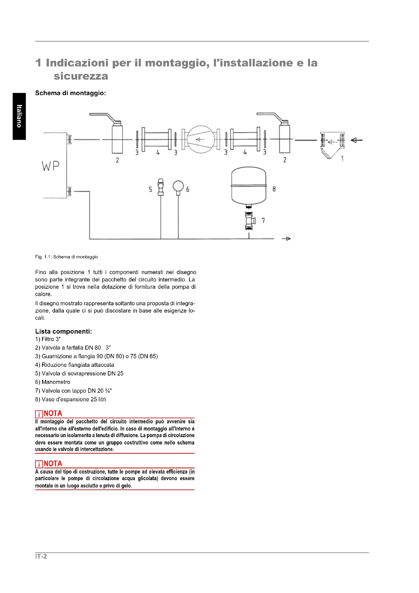 NOTA Il montaggio del pacchetto del circuito intermedio può avvenire sia all'interno che all'esterno dell'edificio. In caso di montaggio all'interno è necessario un isolamento a tenuta di diffusione. La pompa di circolazione deve essere montata come un gruppo costruttivo come nello schema usando le valvole di intercettazione. NOTA A causa del tipo di costruzione, tutte le pompe ad elevata efficienza (in particolare le pompe di circolazione acqua glicolata) devono essere montate in un luogo asciutto e privo di gelo.IT-3 Italiano